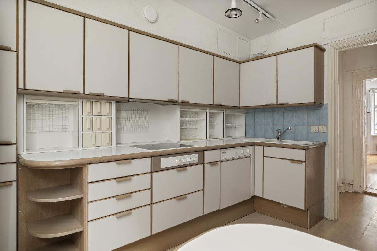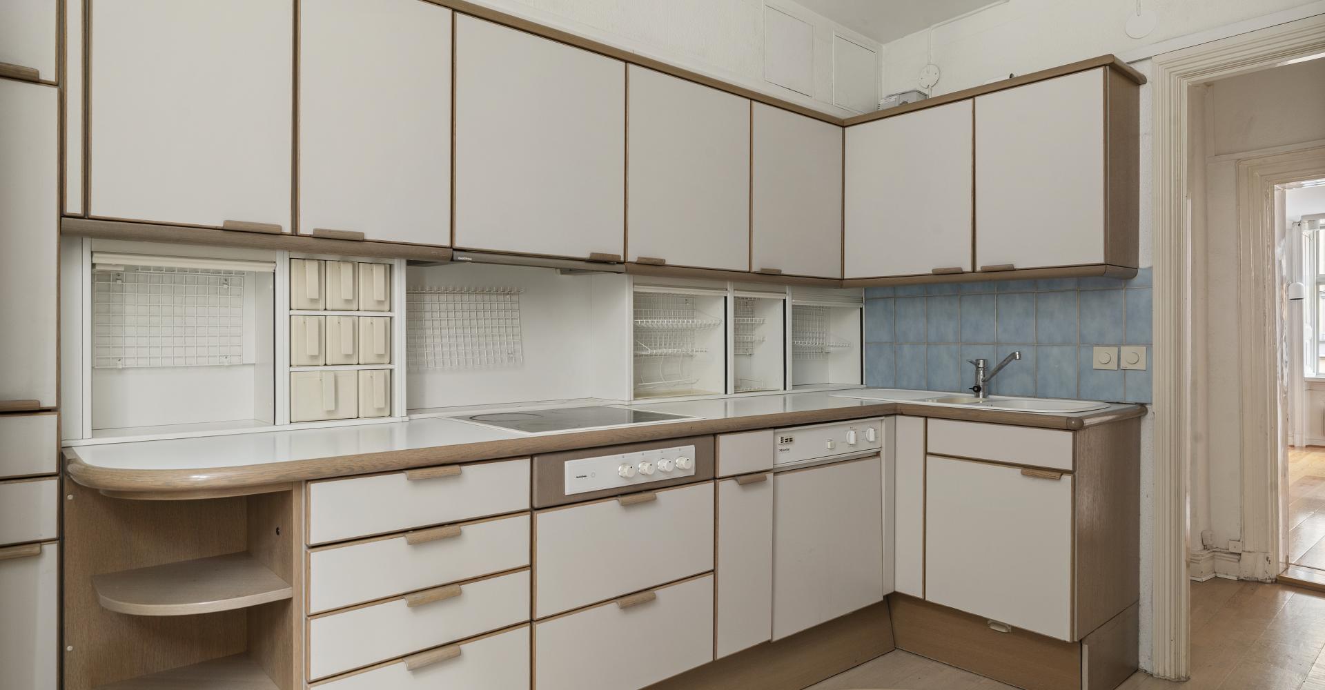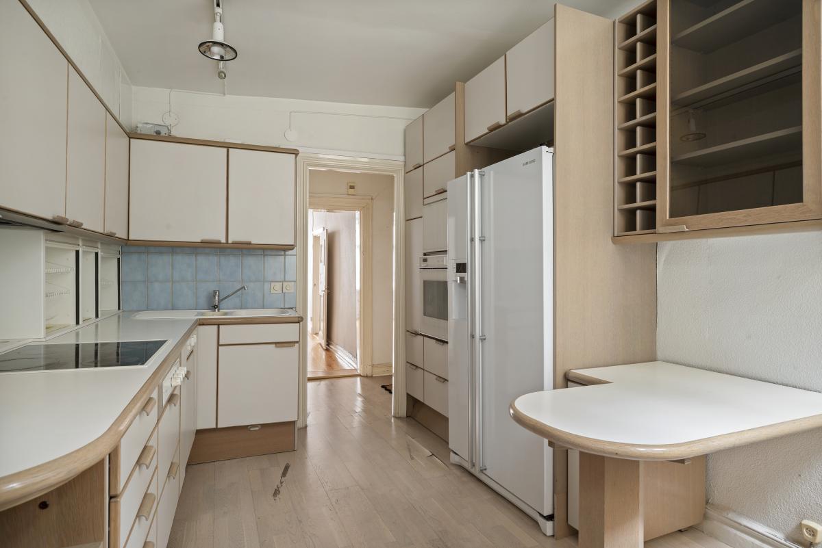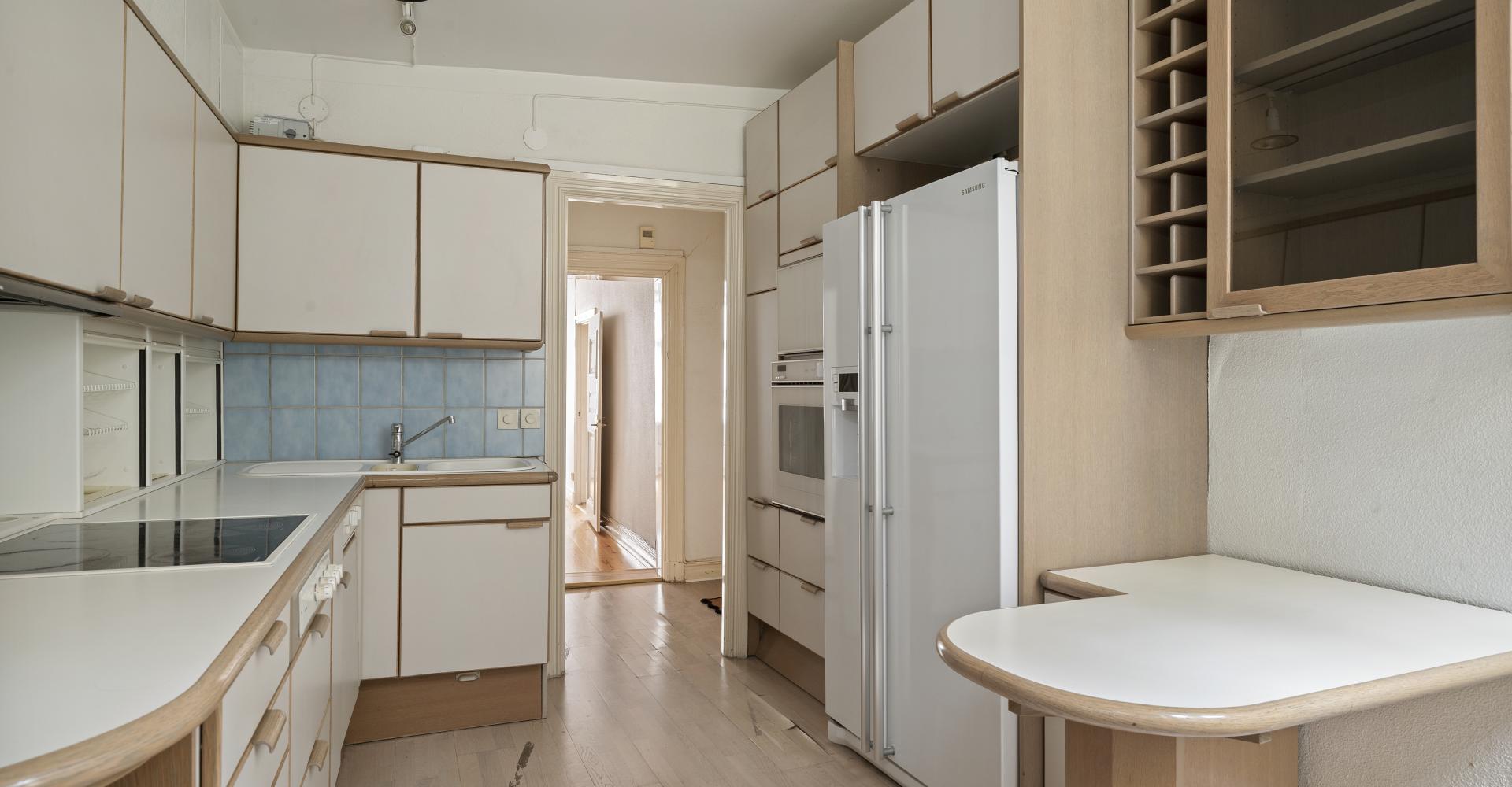 Till vänster ligger ett rymligt kök med fönster mot innergården. Takspotlights, spishäll, fläkt, separat inbyggdsugn och mikro (Gaggenau) diskmaskin (Miele). Modern kyl/frys "side by side" med ismaskin.