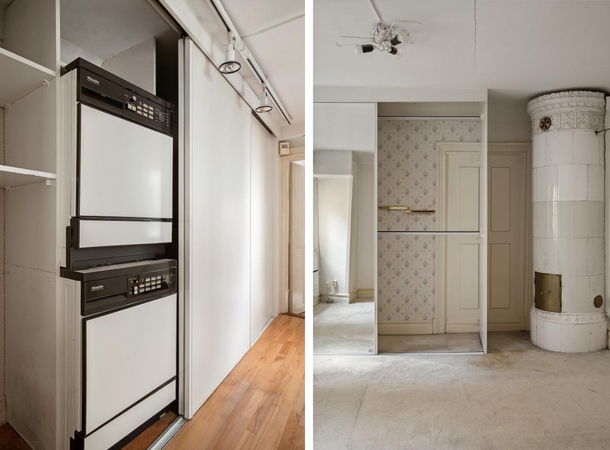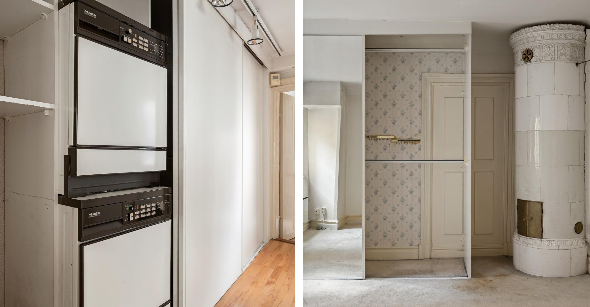 hel garderobslänga med inbyggd tvättmaskin och torktumlare