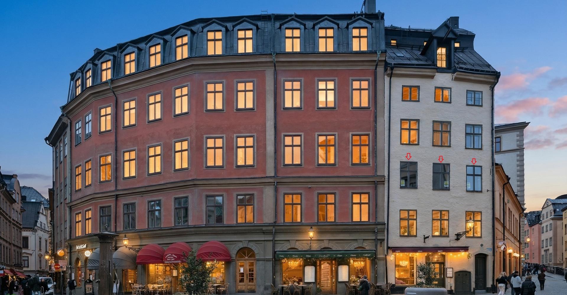 Unik byggnad med ett historiskt intressant läge i Gamla Stan där Evert Taubes staty bevakar torget strax utanför porten.