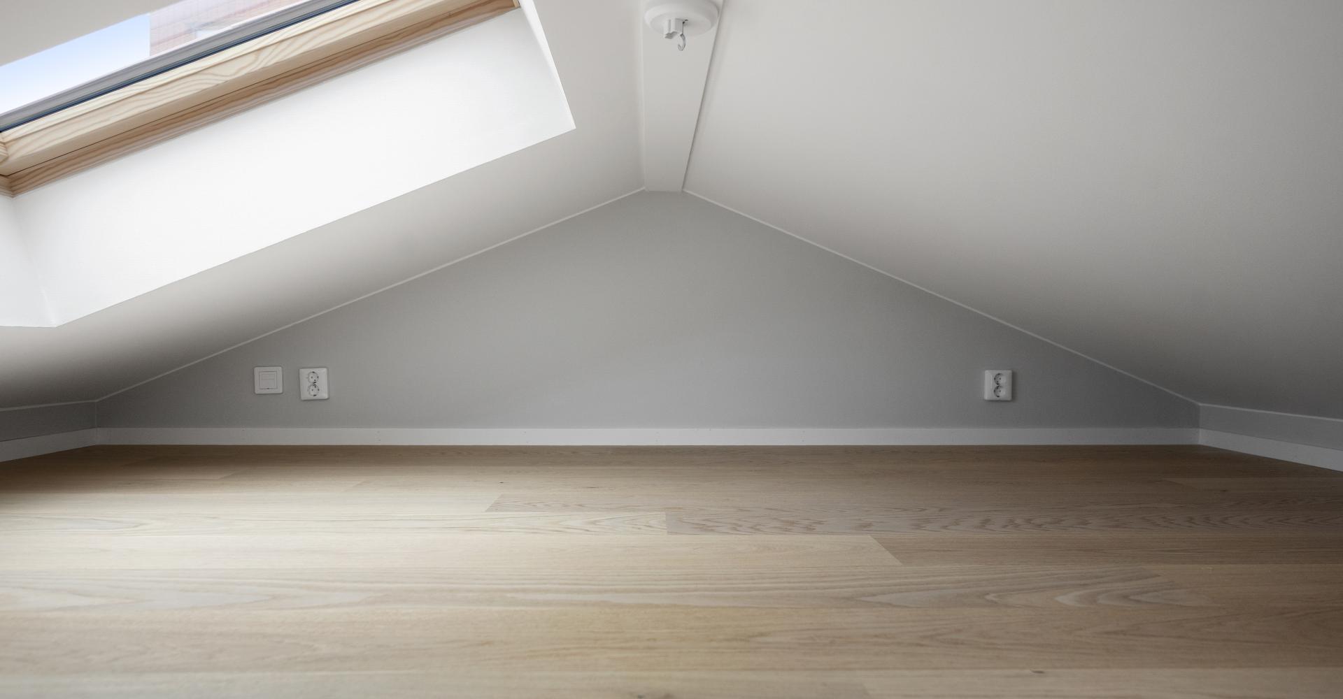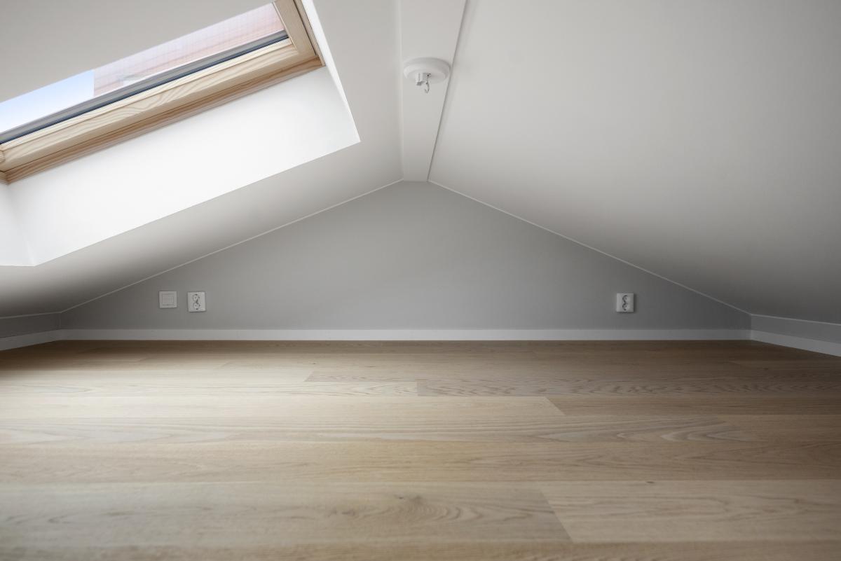 Loft med parkettgolv och takfönster.