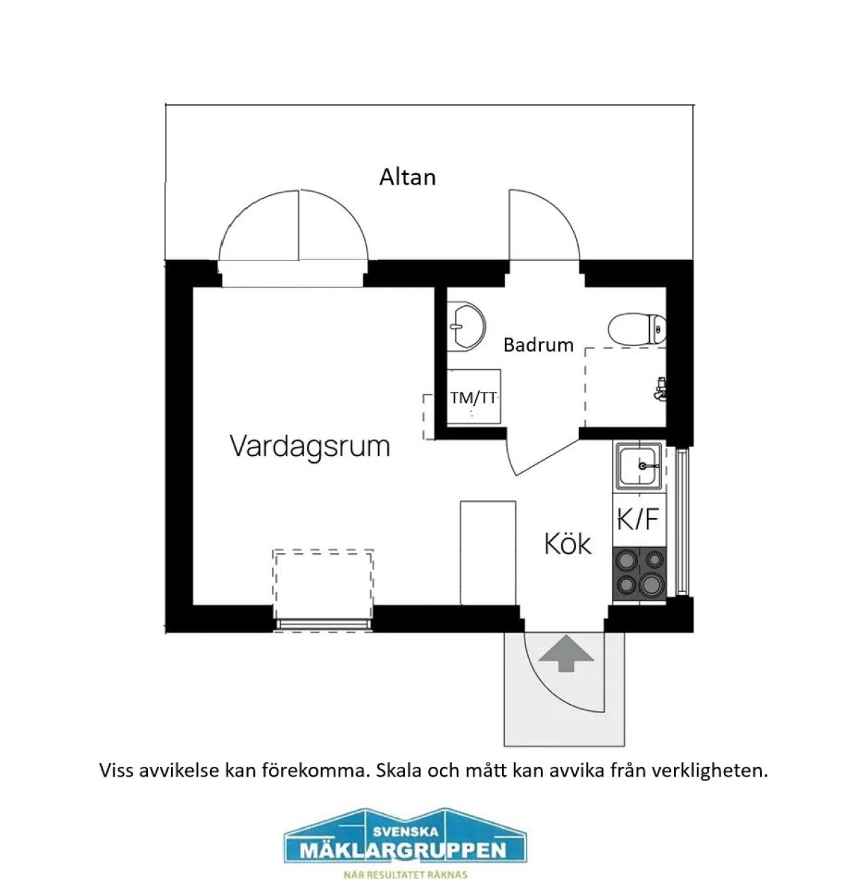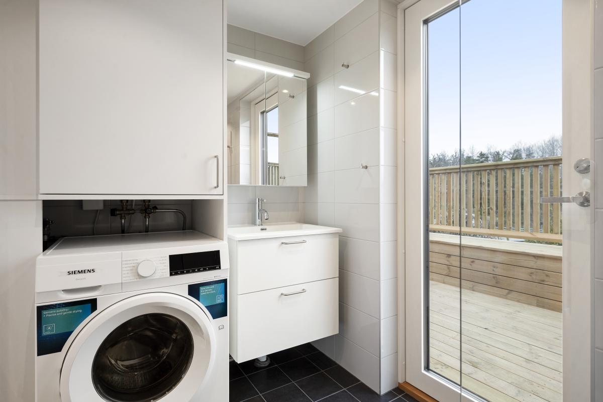Badrum med klinkergolv (golvvärme), halkaklade väggar samt spotlights i tak. Utgång till altan. Badrummet är utrustat med w.c., handfat, badrumsskåp, dusch med duschväggar, tvättmaskin kombinerad torktumlare(Siemens) samt vvb.