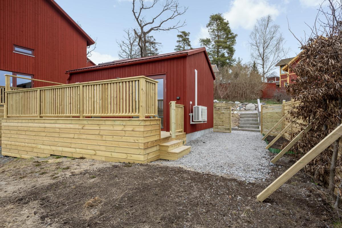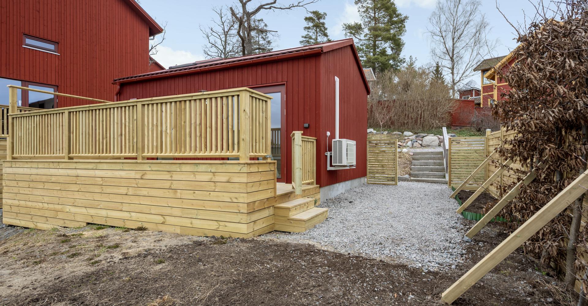 Helt nybyggt Attefallshus med trädäckad altan.