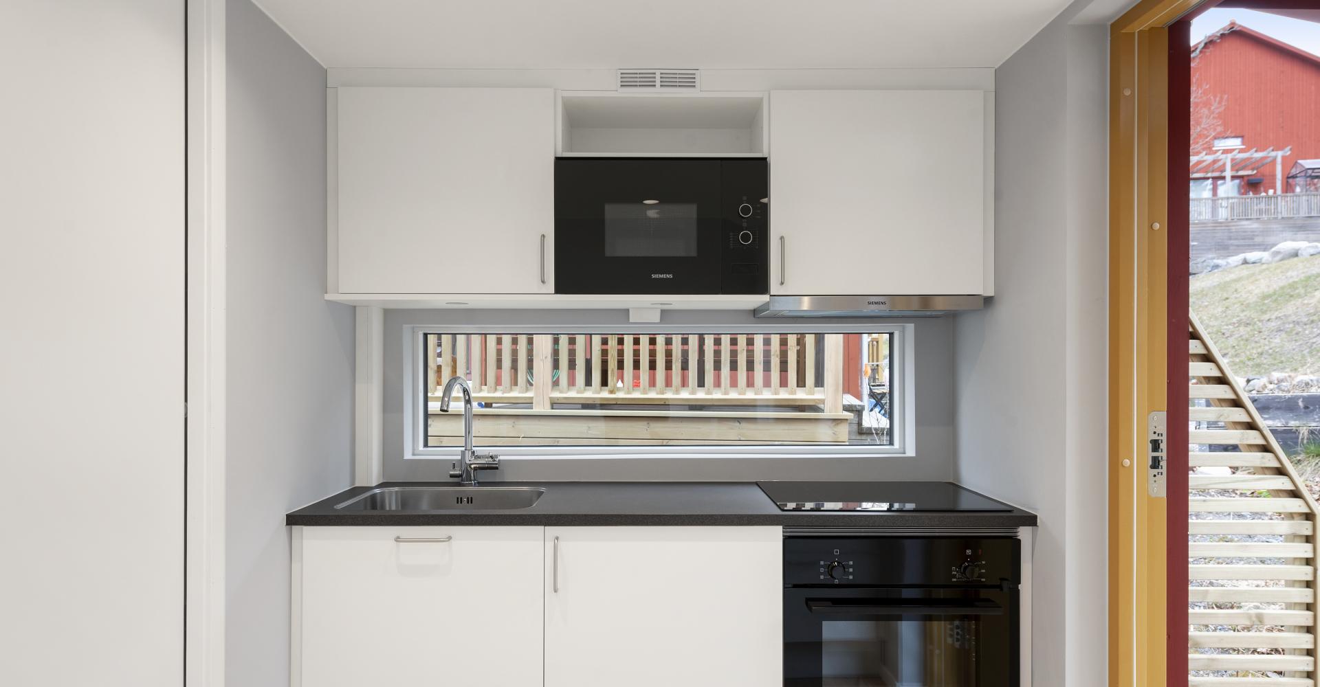 Köket är utrustat med induktionshäll (Siemens), spisfläkt (Siemens), ugn (Siemens), micro (Siemens) och kyl (Siemens).