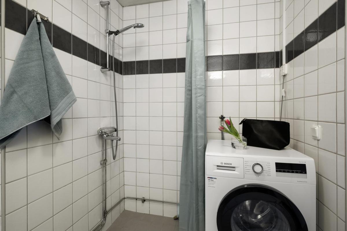 Även tvättmaskin och duschhörna ryms i det rymliga badrummet