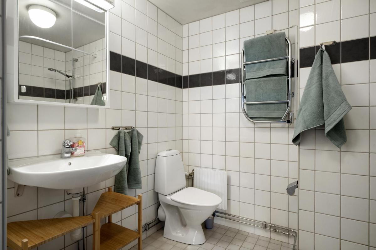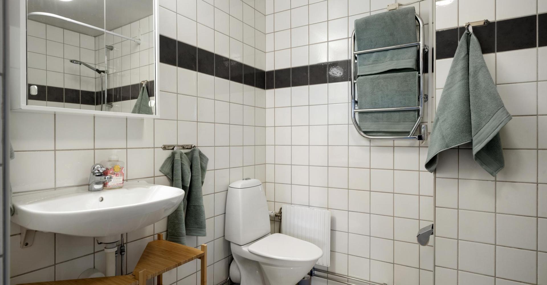 Intill hallen ligger det rymliga och helkaklade badrummet – en praktisk och funktionell oas med gott om utrymme. Här ryms dusch, WC och handfat. Utrustat med tvättmaskin, element och handdukstork för extra komfort i vardagen.