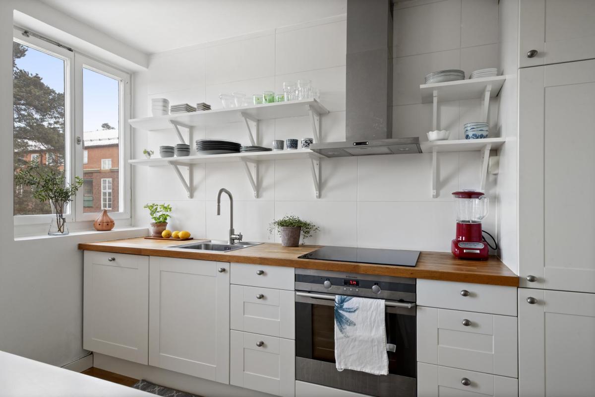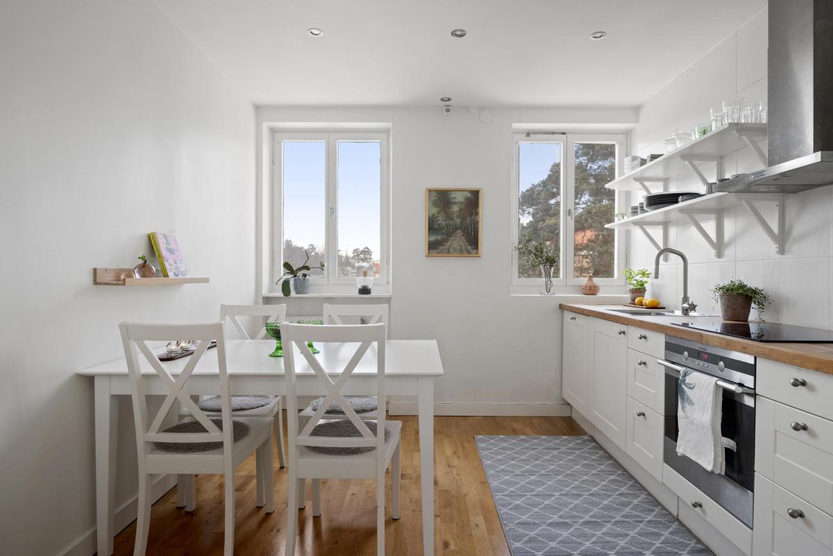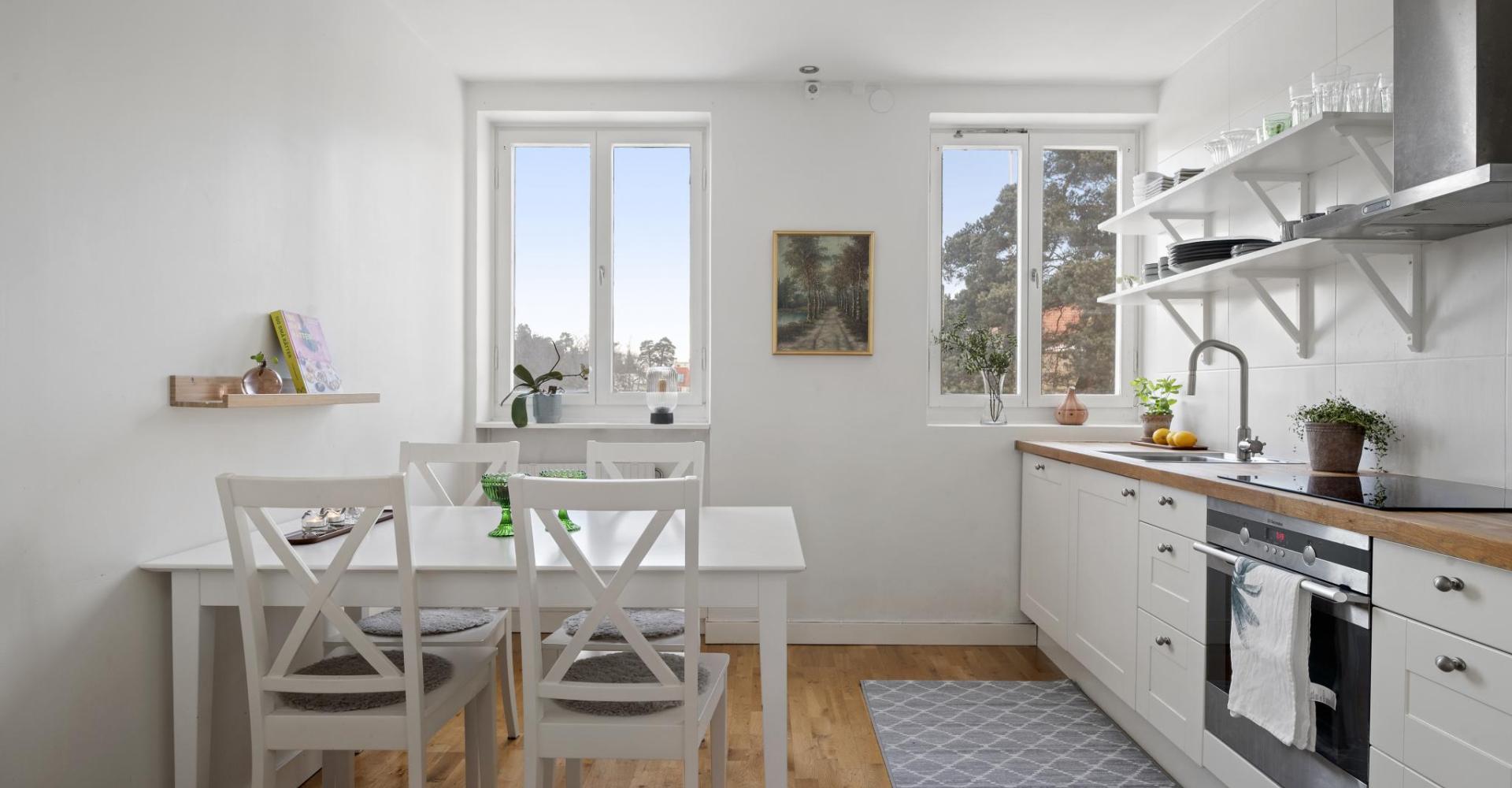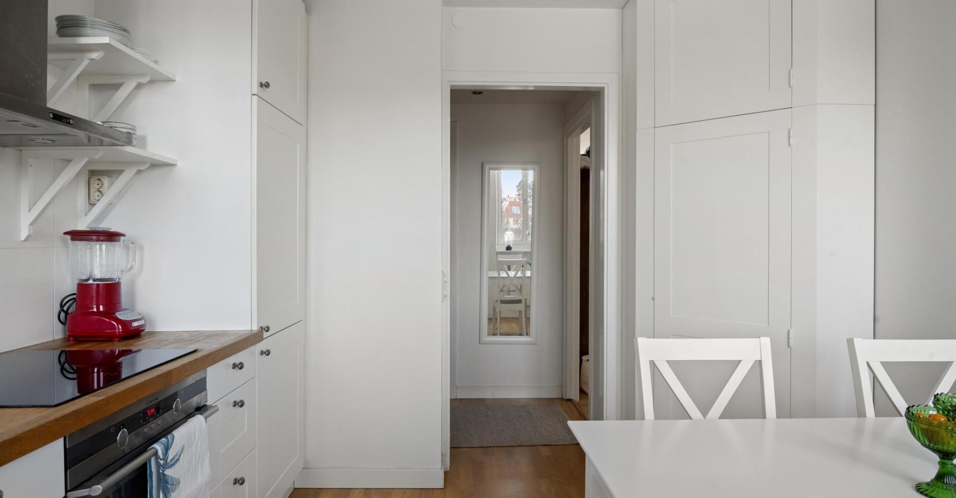 Till höger om hallen öppnar sig ett ljust och tilltalande kök med tidlös ljus skåpinredning och stora vita kakelplattor ovanför arbetsbänken i ek. Ovan arbetsytorna finns öppna hyllplan som skapar både karaktär och praktisk förvaring. Köket är fullutrustat med rostfri fläkt, induktionshäll (ny 2026), ugn, integrerad diskmaskin samt kyl/frys. Ett charmigt platsbyggt hörnskåp erbjuder ytterligare förvaringsmöjligheter. Vitmålade väggar, ekparkettgolv och spotlights i taket fulländar rummet.