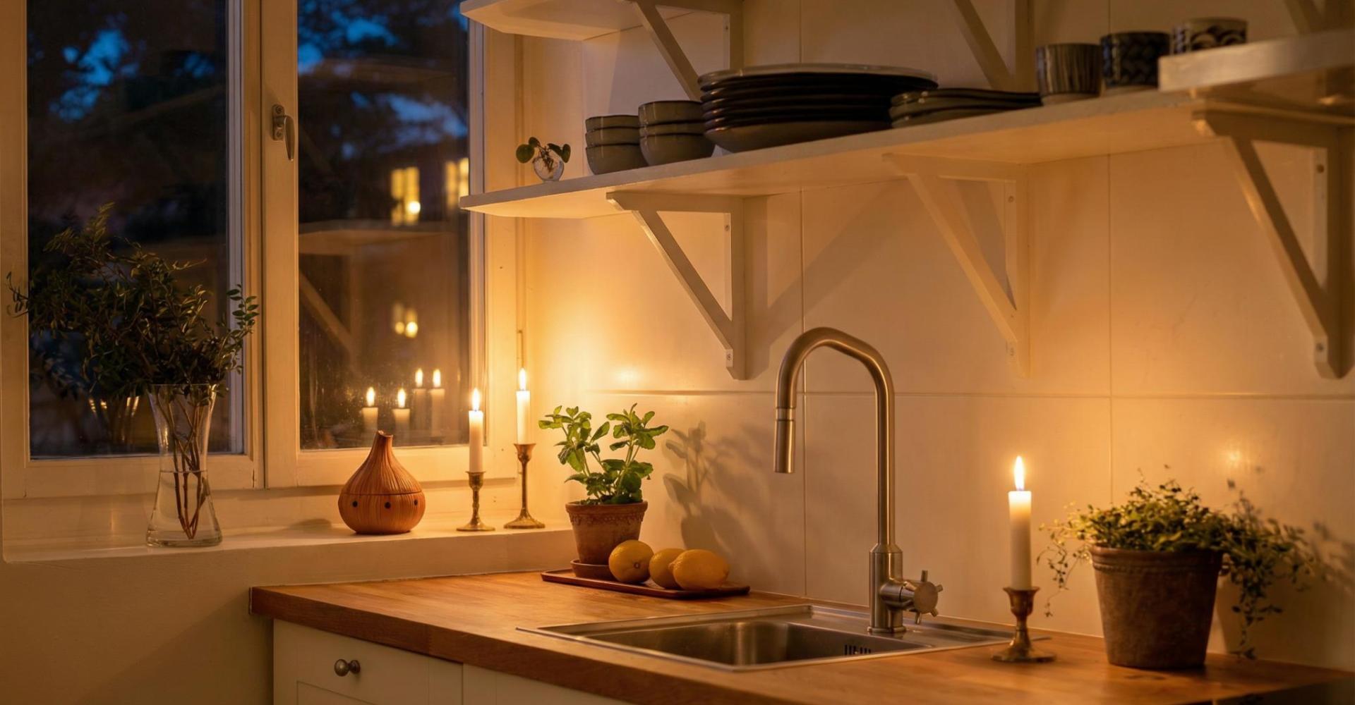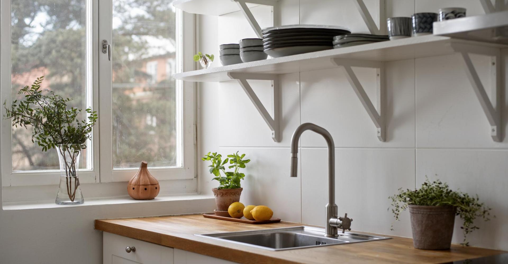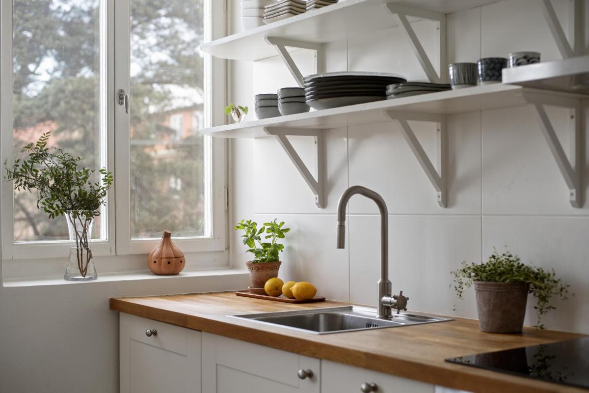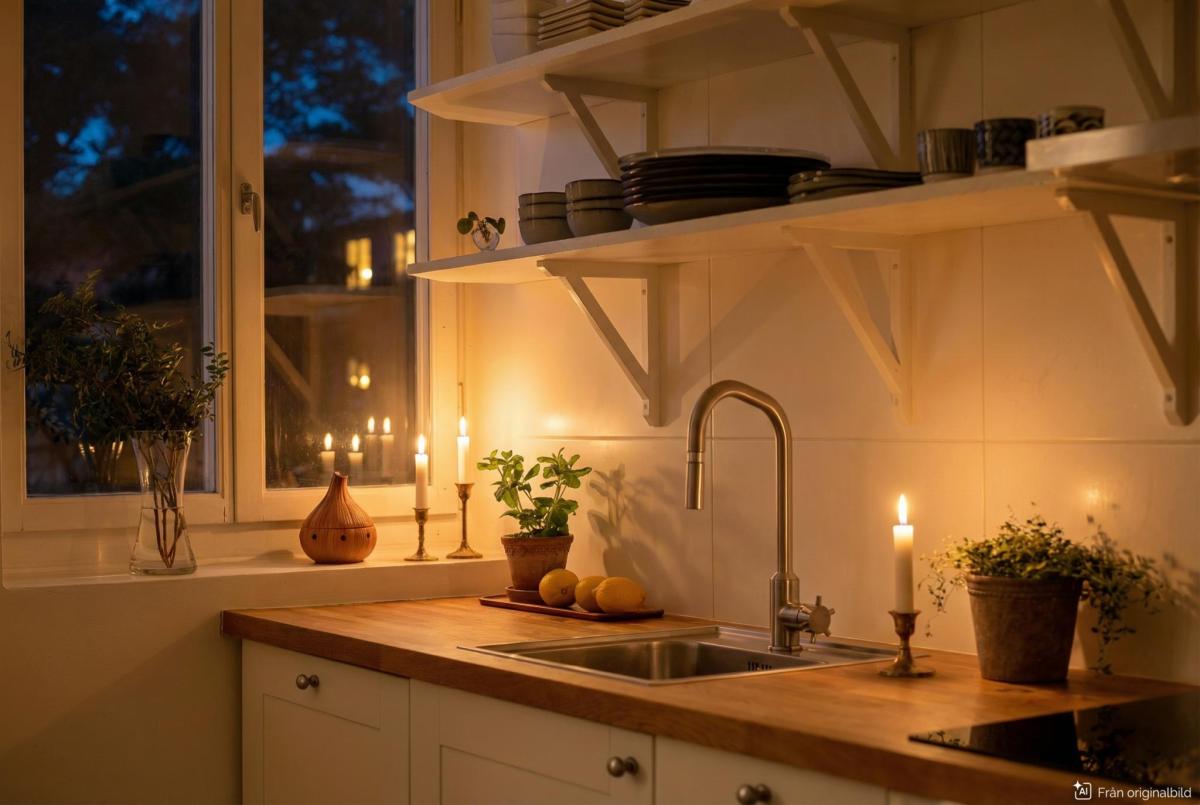 Till höger om hallen öppnar sig ett ljust och tilltalande kök med tidlös ljus skåpinredning och stora vita kakelplattor ovanför arbetsbänken i ek. Ovan arbetsytorna finns öppna hyllplan som skapar både karaktär och praktisk förvaring. Köket är fullutrustat med rostfri fläkt, induktionshäll (ny 2026), ugn, integrerad diskmaskin samt kyl/frys. Ett charmigt platsbyggt hörnskåp erbjuder ytterligare förvaringsmöjligheter. Vitmålade väggar, ekparkettgolv och spotlights i taket fulländar rummet.