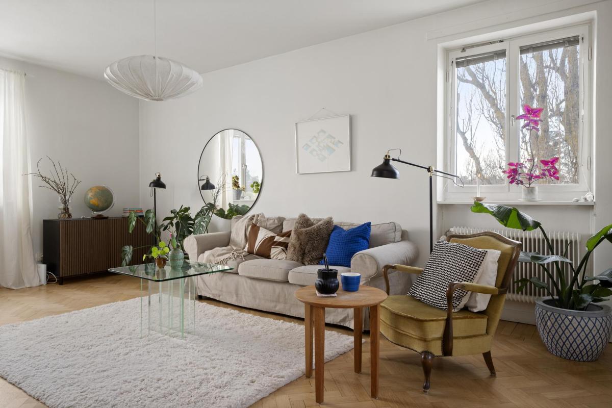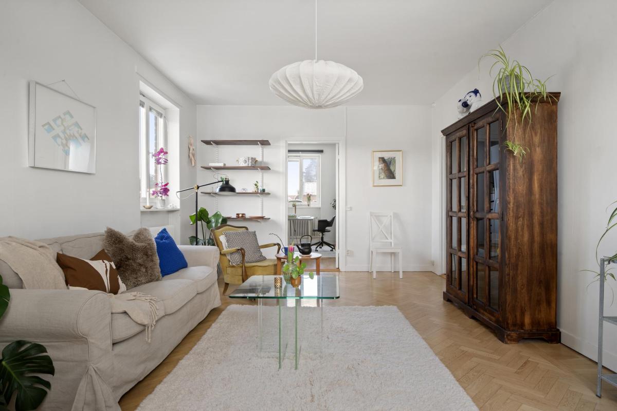 Lägenhetens hjärta är det generösa vardagsrummet med vacker fiskbensparkett och ljusinsläpp från två väderstreck. De vitmålade väggarna förstärker rymden och skapar en harmonisk atmosfär. Här finns plats för både en soffgrupp och en naturlig arbets- eller läshörna.
