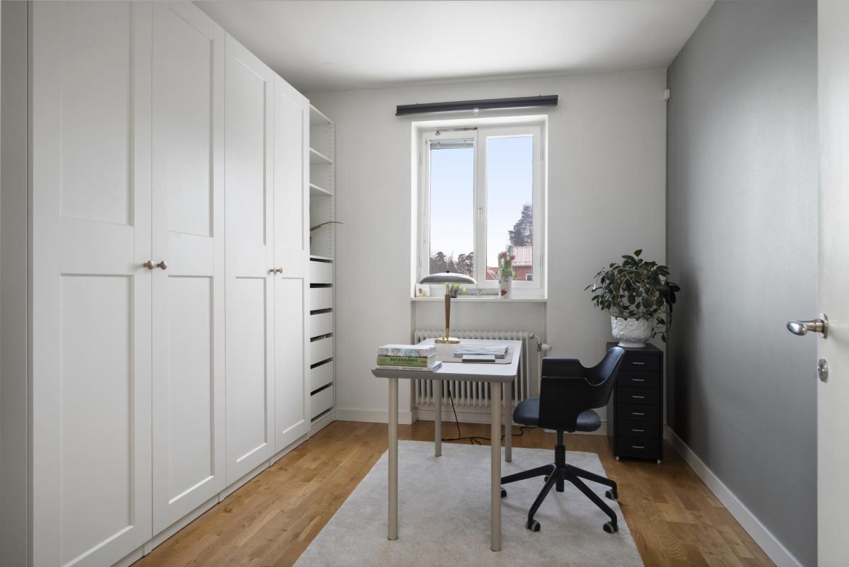 Intill köket ligger ett rogivande sovrum med ekparkett och ljusa väggar och en fondvägg. Rummet erbjuder gott om garderober.