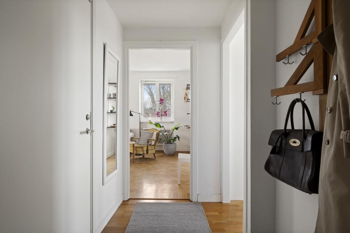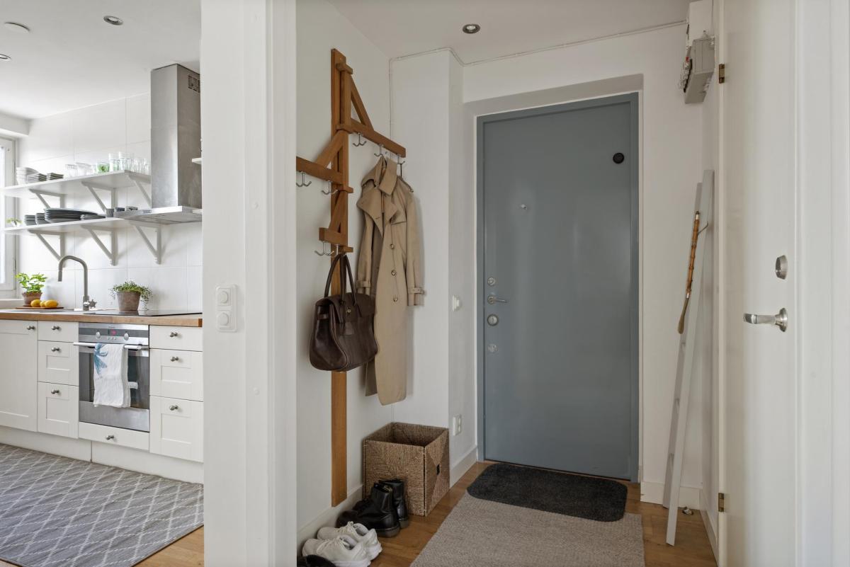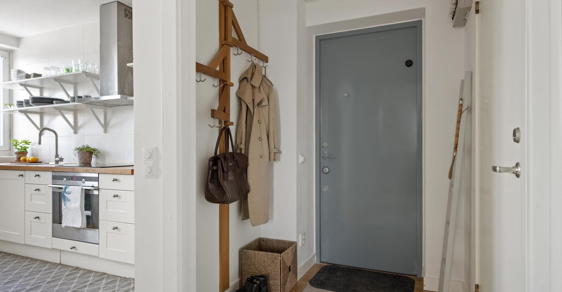 Redan i hallen märks bostadens stilrena helhet med ekparkett, ljusa väggar och infällda spotlights. Här finns gott om plats för avhängning.