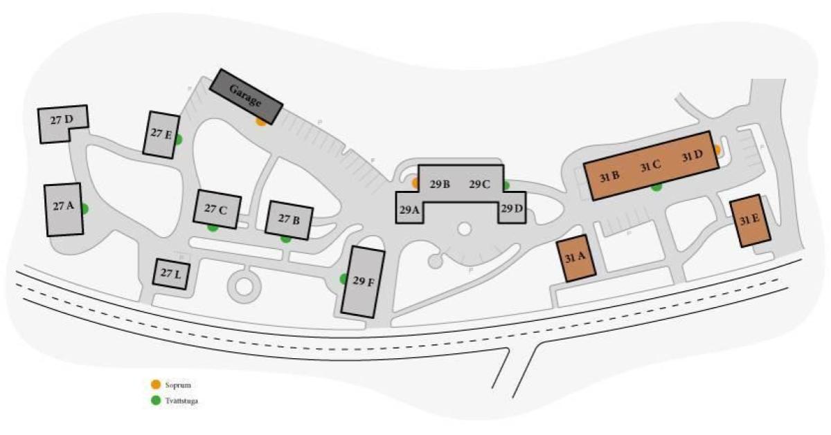 Bilden är från föreningens webbplats och visar de 11 hus som ingår i föreningen. De gröna markeringarna visar föreningens tvättstugor.