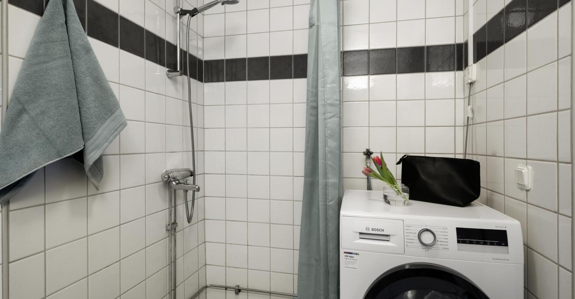 Intill hallen ligger det rymliga och helkaklade badrummet med dusch, WC, handfat med spegelskåp, element och handdukstork. Här finns även en praktisk tvättmaskin.