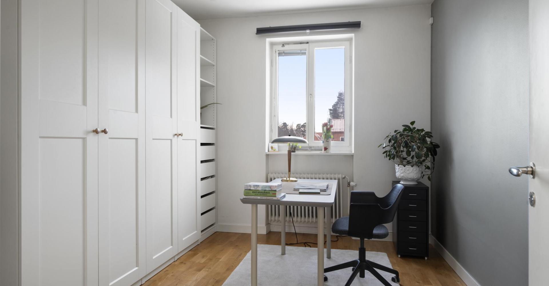 Det första sovrummet ligger praktiskt placerat intill köket och erbjuder ljusa väggar, ekparkett och gott om garderober.