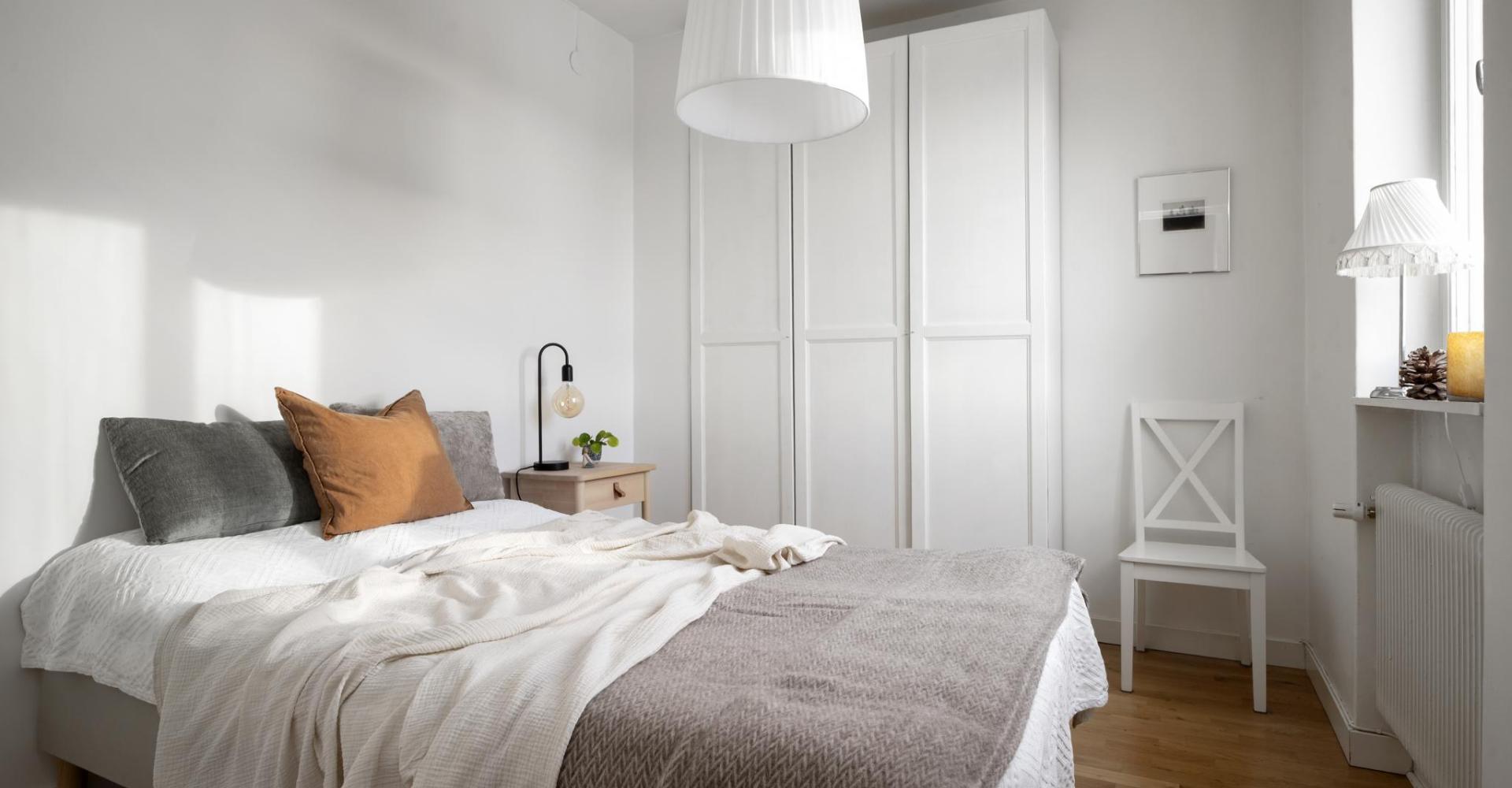 Innanför vardagsrummet ligger ytterligare ett rofyllt sovrum med ekparkett, vitmålade väggar och ett fönster som skapar fint ljusinsläpp.