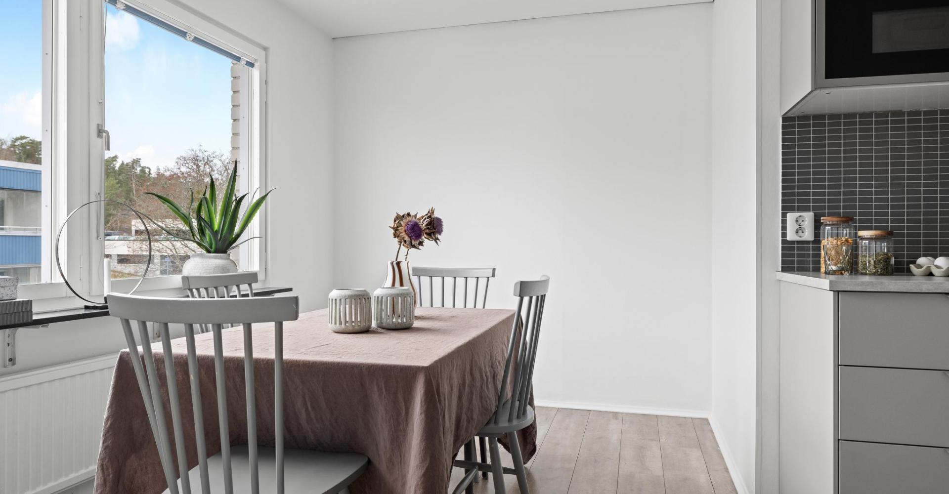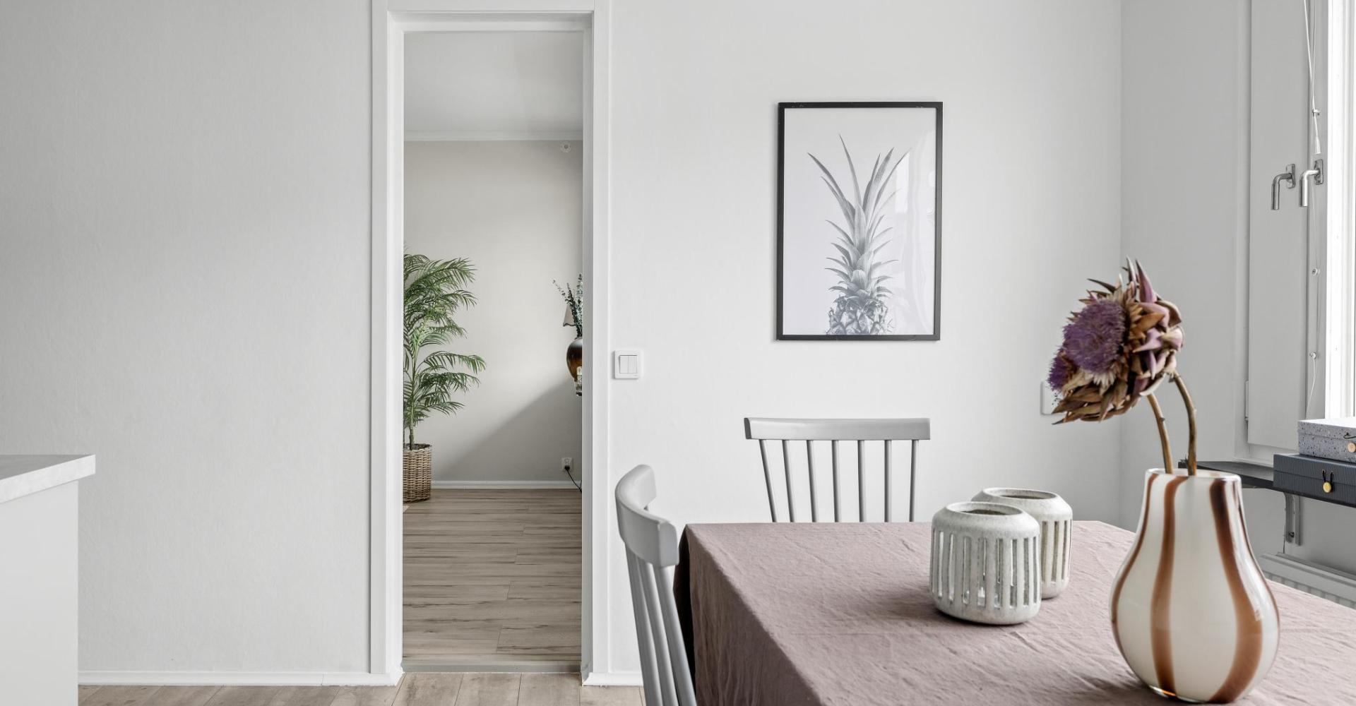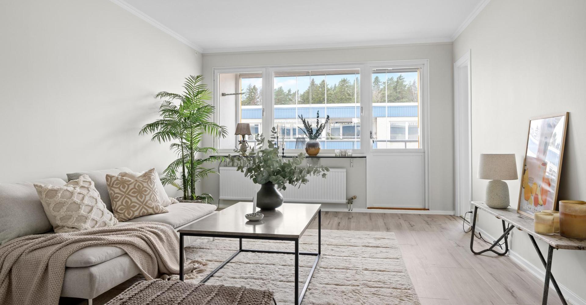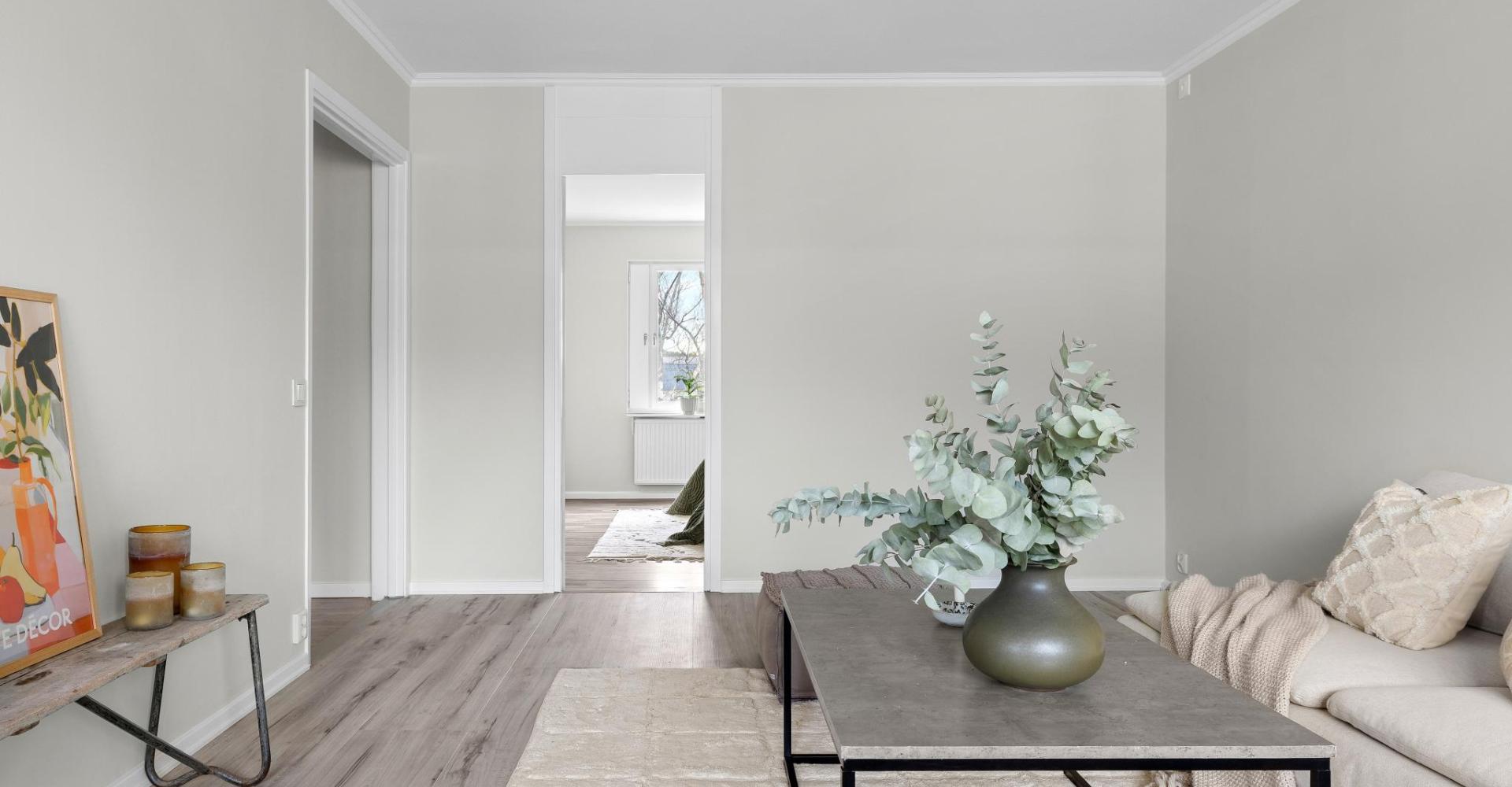 Vardagsrum med laminatgolv typ trätiljor i matchande gråton. Utgång till den inglasade balkongen i rakt västerläge.