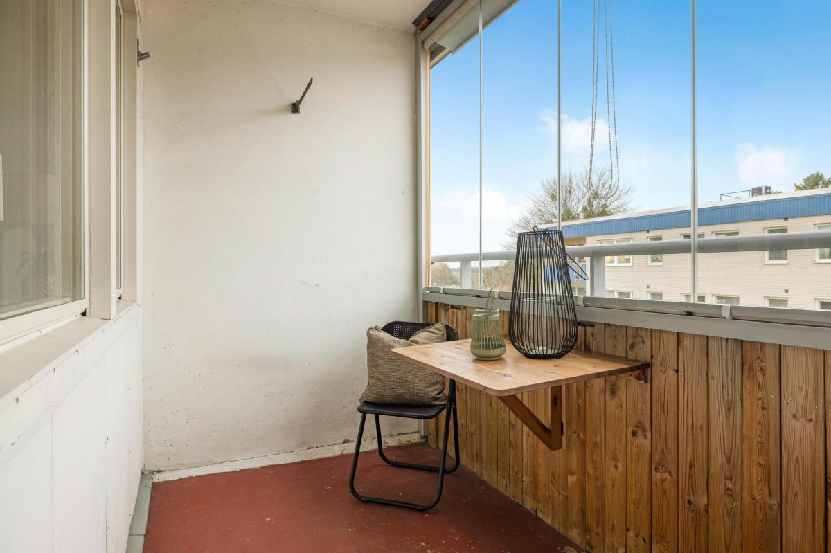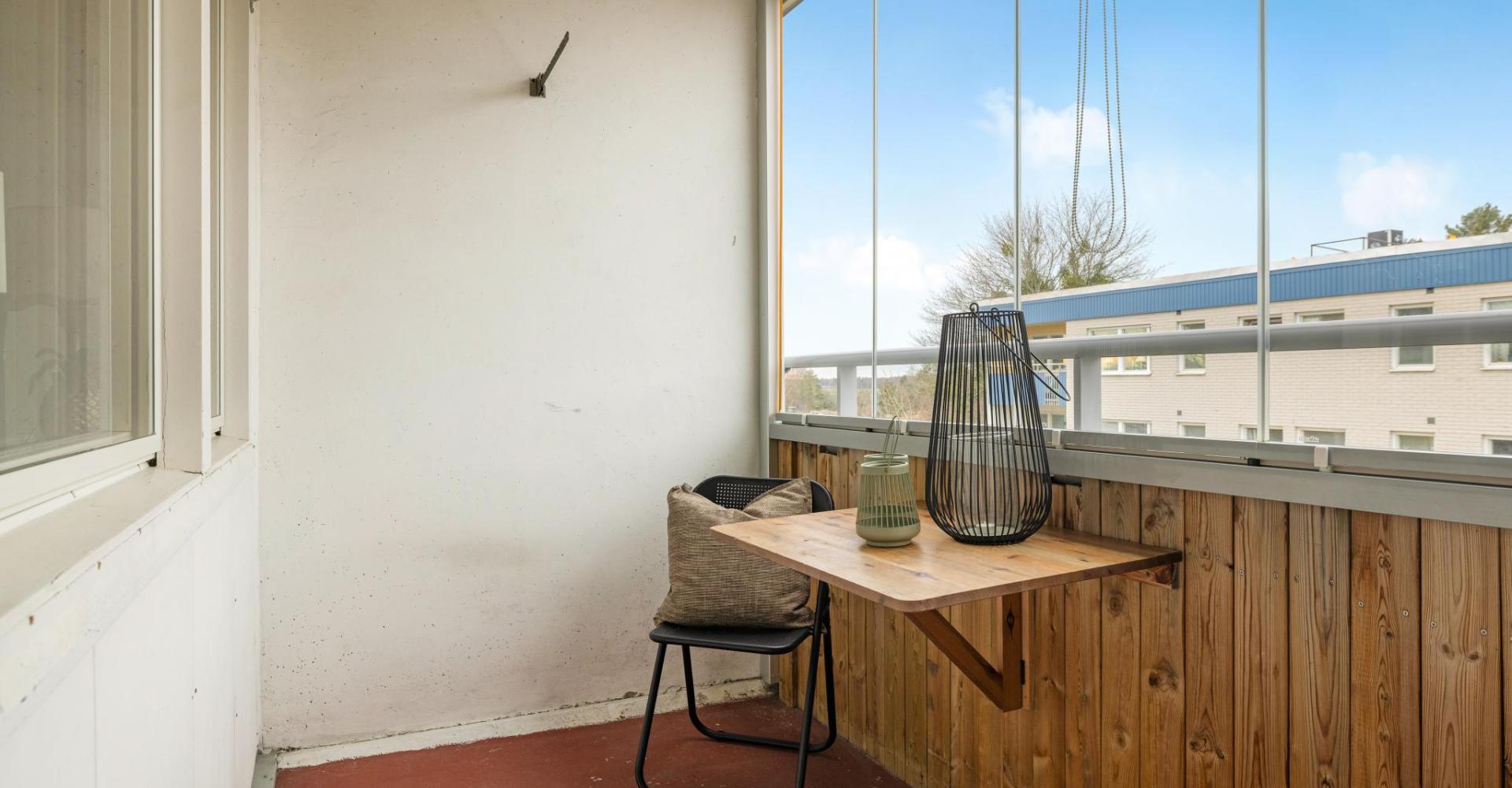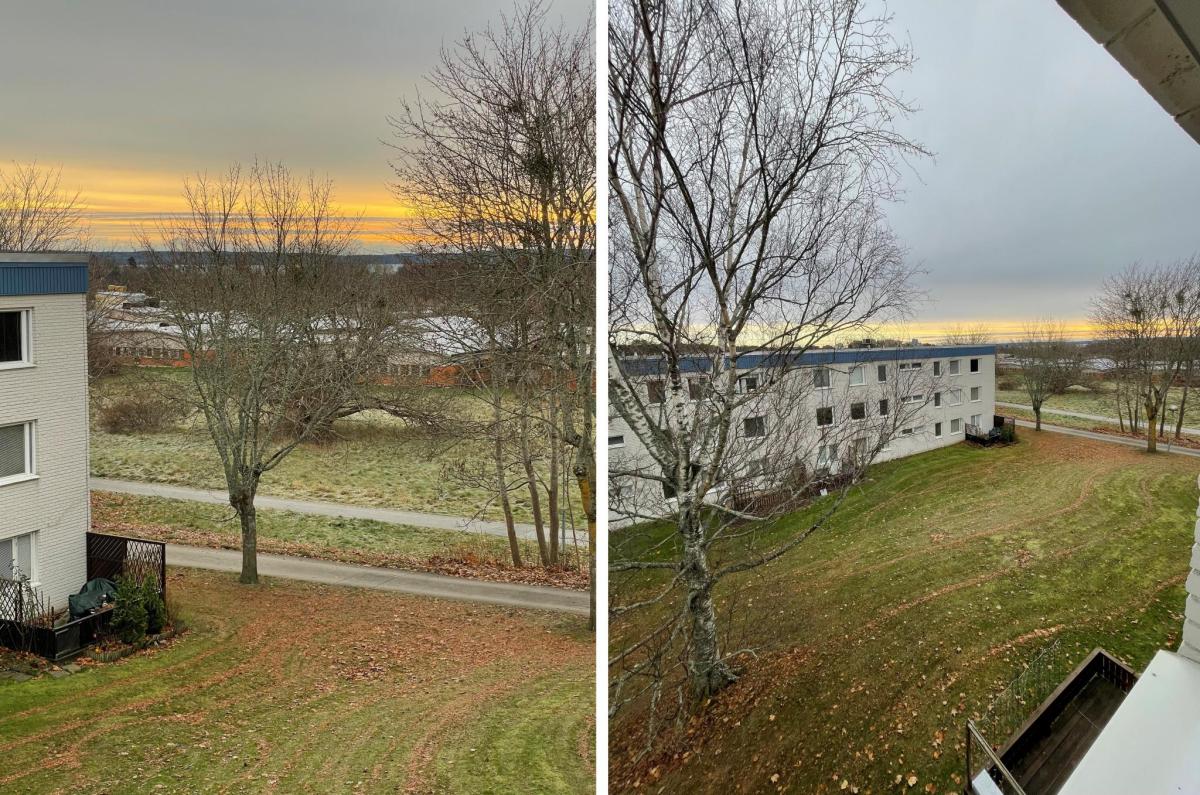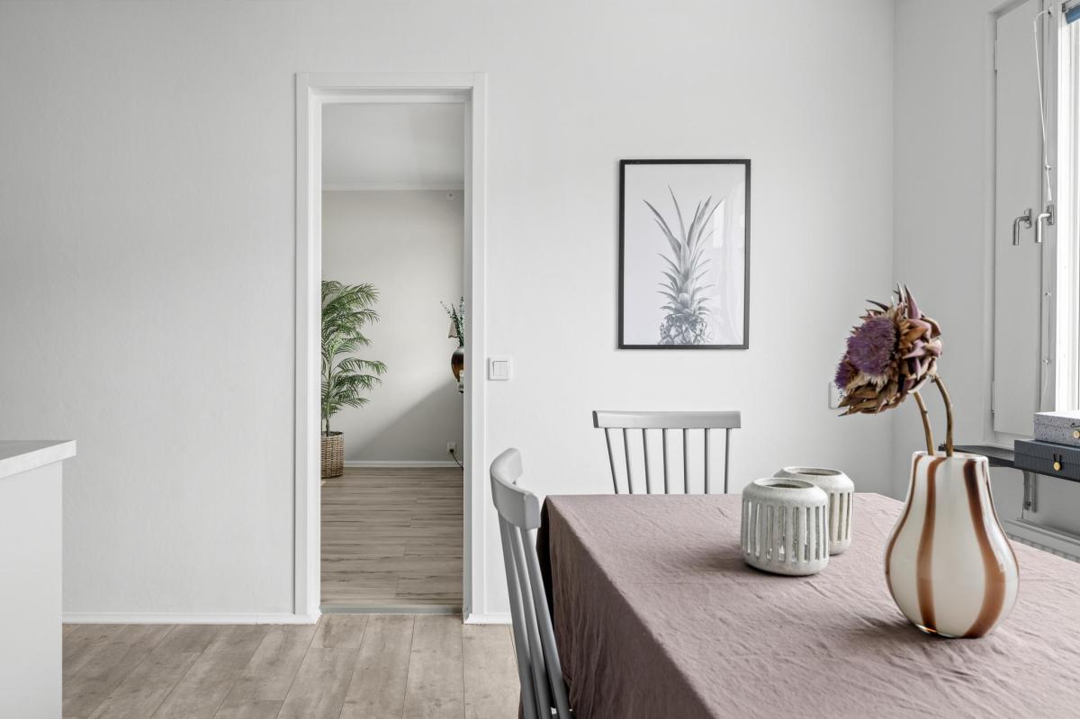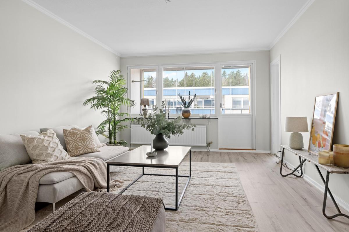 Vardagsrum med laminatgolv typ trätiljor i matchande gråton. Utgång till den inglasade balkongen i rakt västerläge.