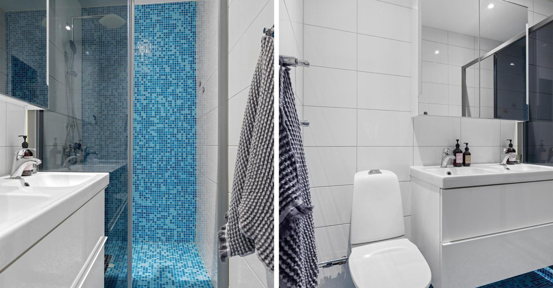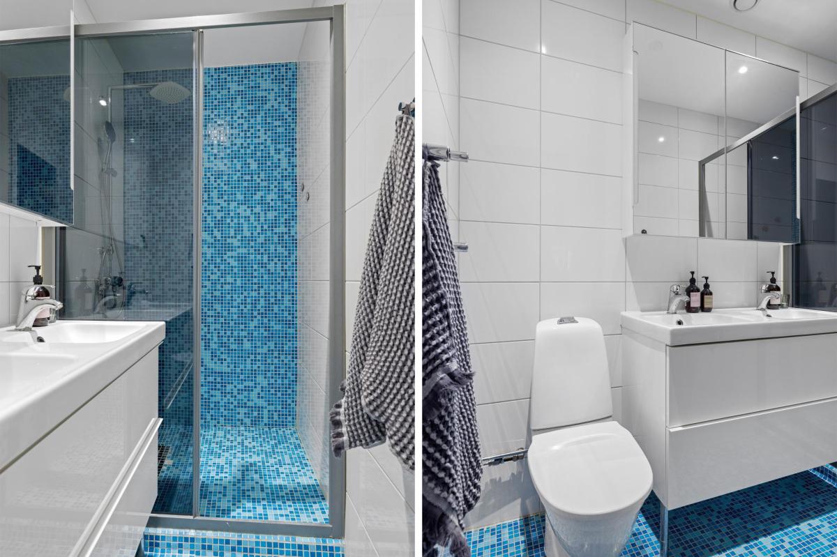 Wc/bad förberett även för tvättmaskin. Golvvärme och infällda takspotlights.