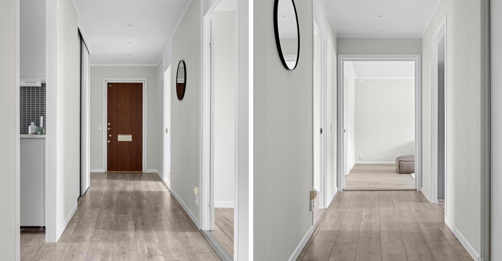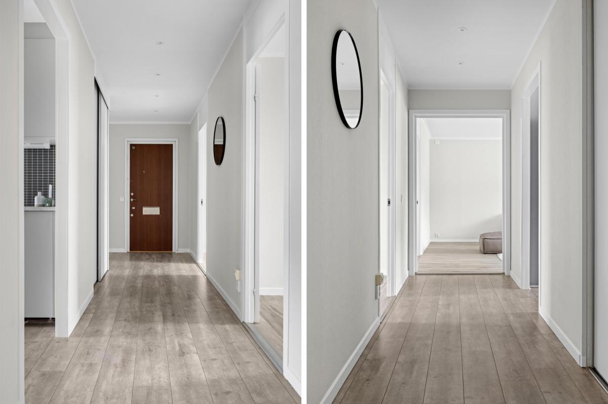 Välkomnade och rymlig hall med slitstarkt laminatgolv, typ naturligt trägolv i vacker modern färgnyans som sedan återfinns genomgående lägenheten.