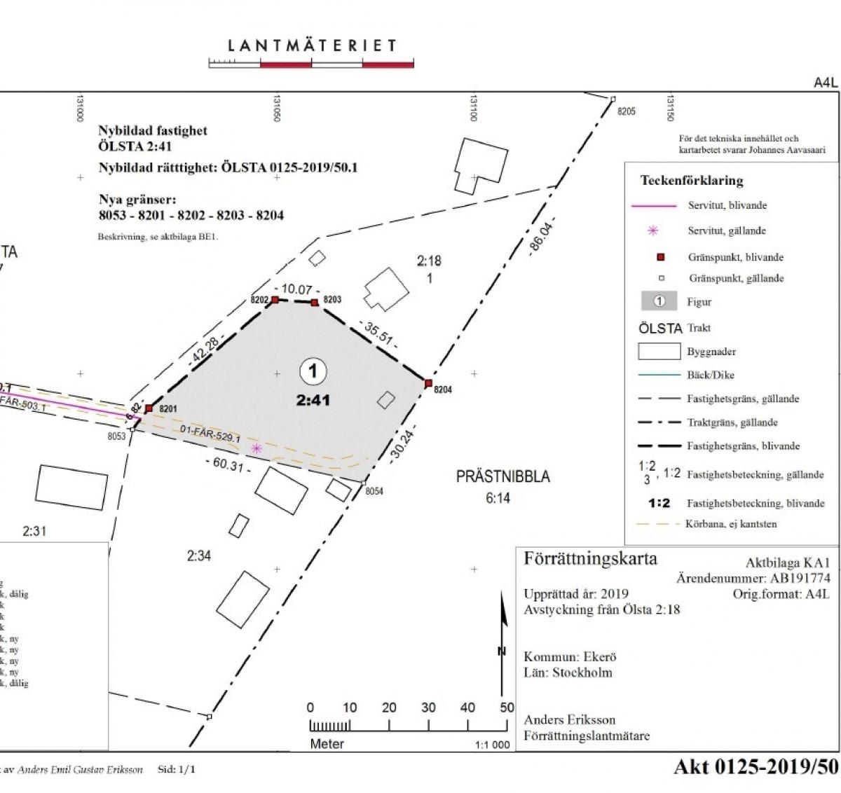- Rättigheter last: Officialservitut: Med det avstyckade området följer rätt att för utfart begagna den området i norr angränsande vägen och vidare samma rätt till utfartsväg till allmän väg, som tillkommer stamfastigheten. - Väg