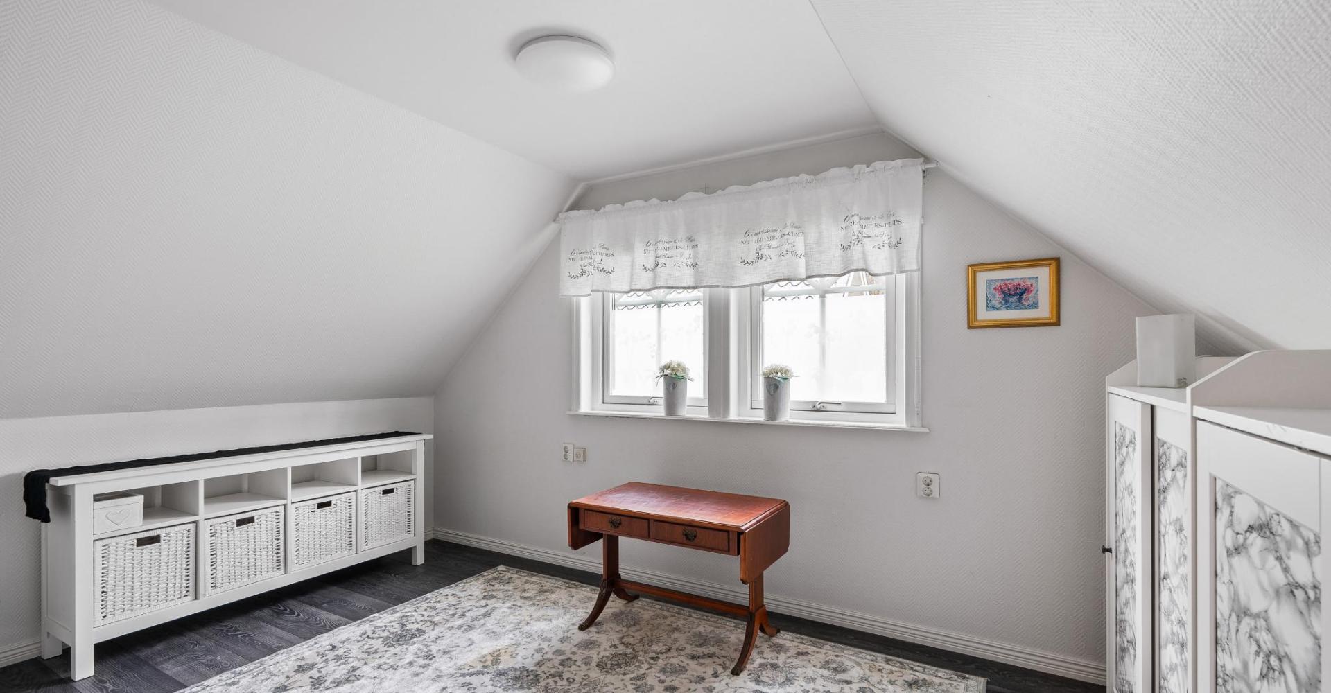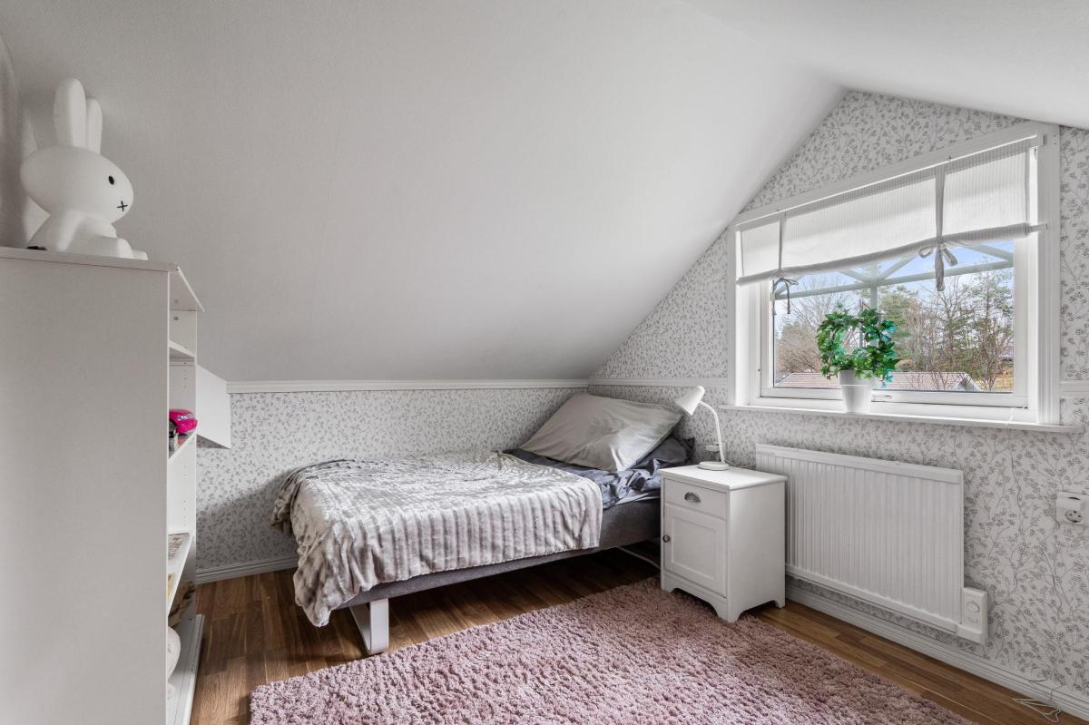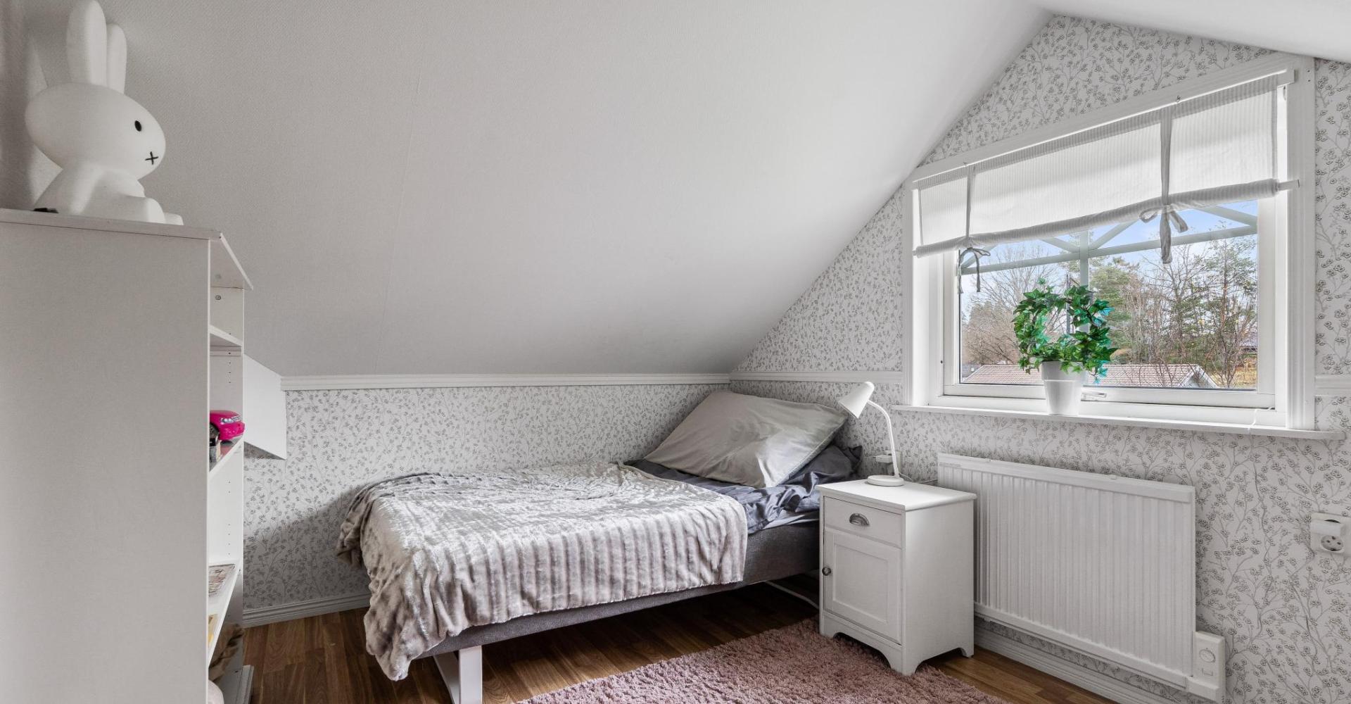 Övre plan når du via trappan från kökets matplats. Här möts du av en ljus hall som leder till ett allrum med plats för både soffhörna och TV. Tre sovrum finns här, varav ett har utgång till en egen privat balkong. Övervåningen rymmer även en mindre WC, charmig handfatskommod och ett spegelskåp ovanför.