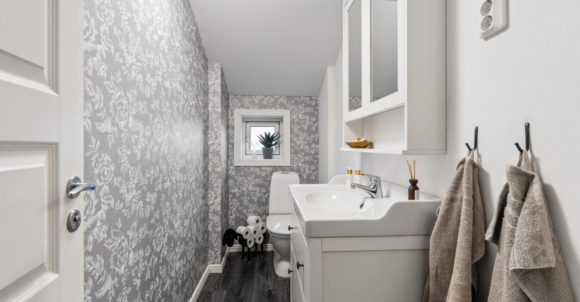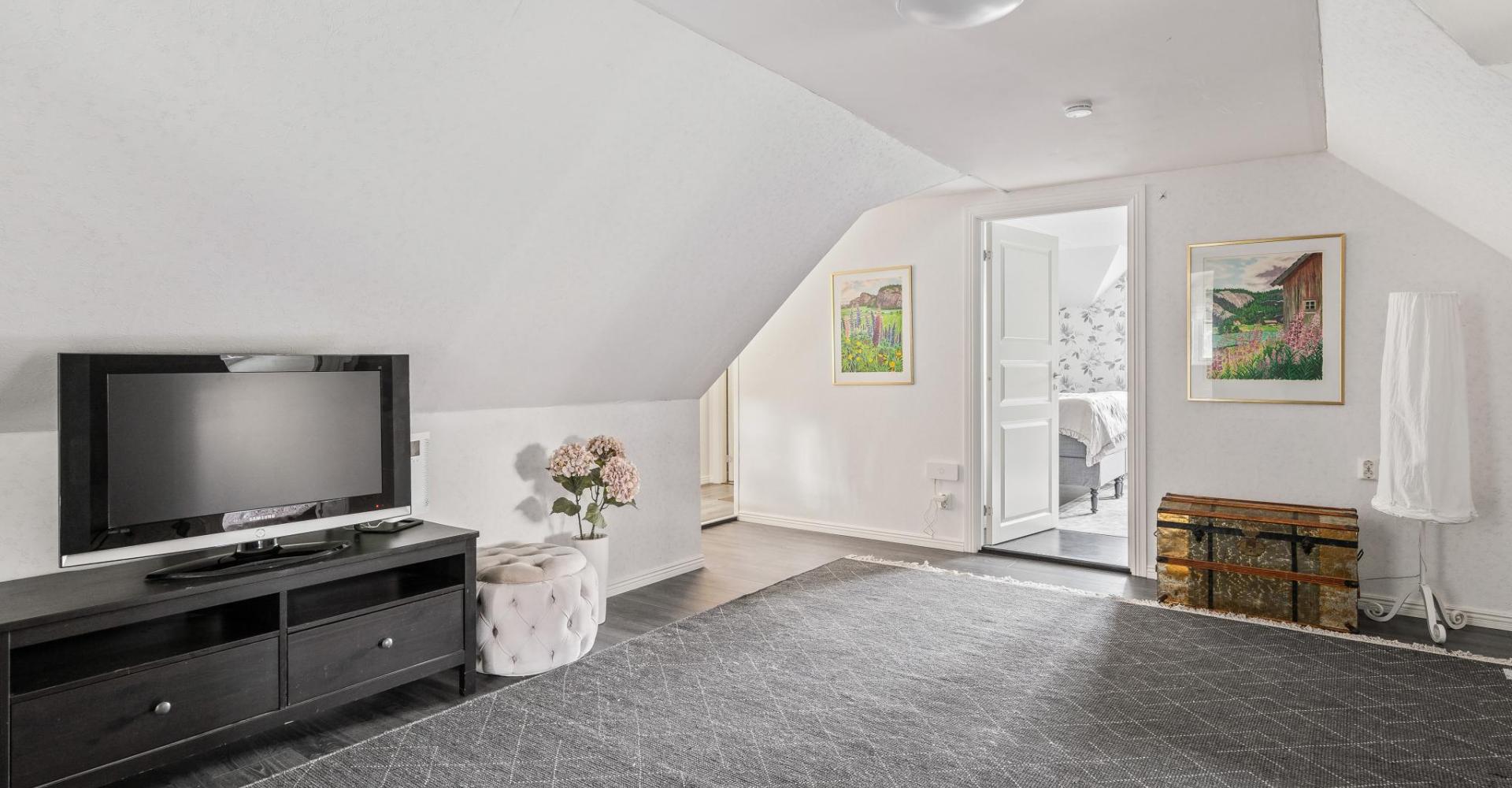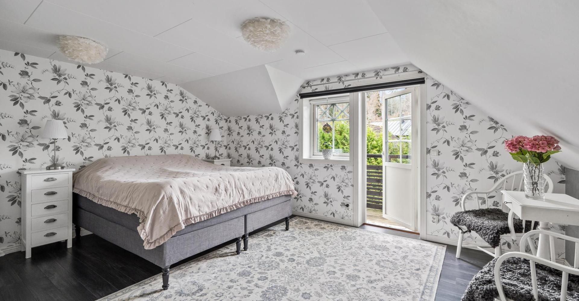 Övre plan når du via trappan från kökets matplats. Här möts du av en ljus hall som leder till ett allrum med plats för både soffhörna och TV. Tre sovrum finns här, varav ett har utgång till en egen privat balkong. Övervåningen rymmer även en mindre WC, charmig handfatskommod och ett spegelskåp ovanför.