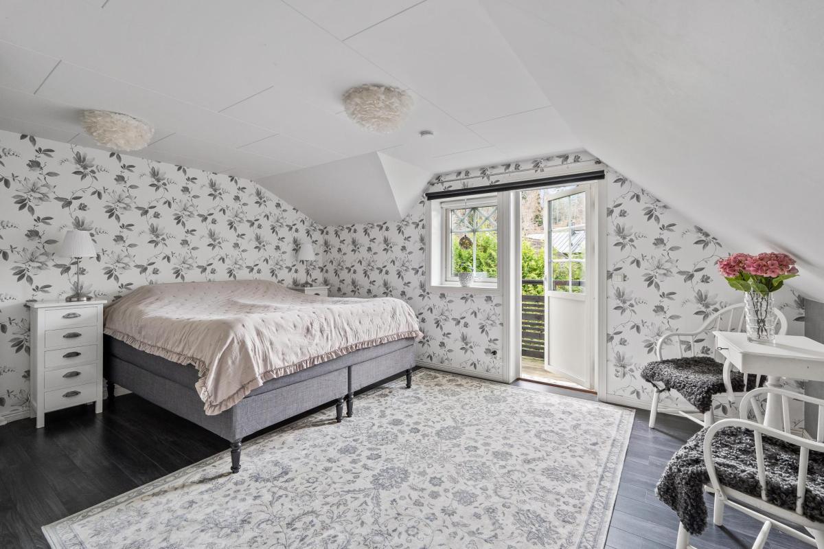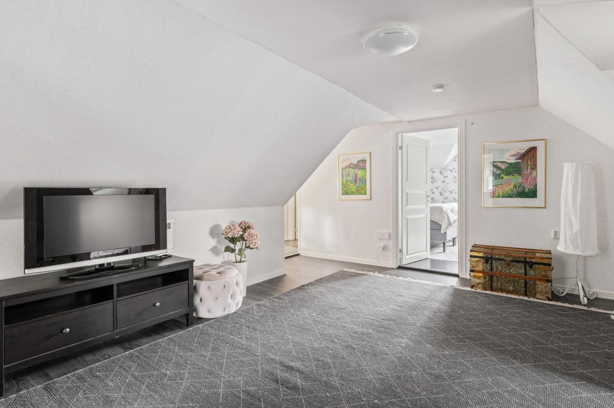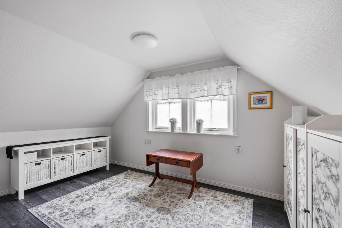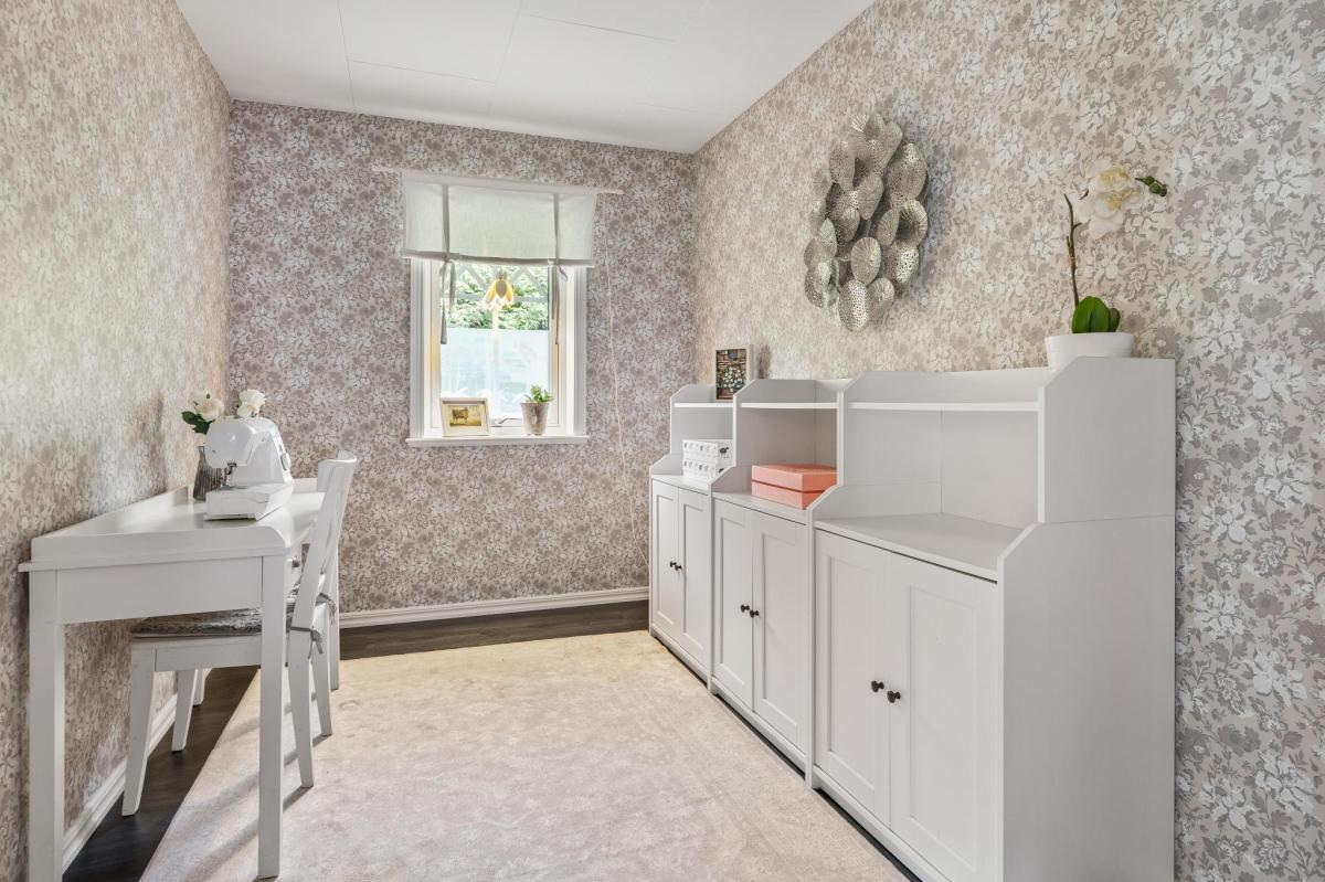Vardagsrummet är rymligt, med braskamin och ytterligare pardörrar som leder ut till en mysig veranda under tak. På entréplan finns även ett helkaklat badrum med badkar, dubbla handfat och WC, samt en stor tvättstuga med dusch, tvättmaskin, torktumlare och en utgång till husets sida. Intill köket finns ett extra rum som kan användas som sovrum, kontor eller varför inte ett lyxigt skafferi.