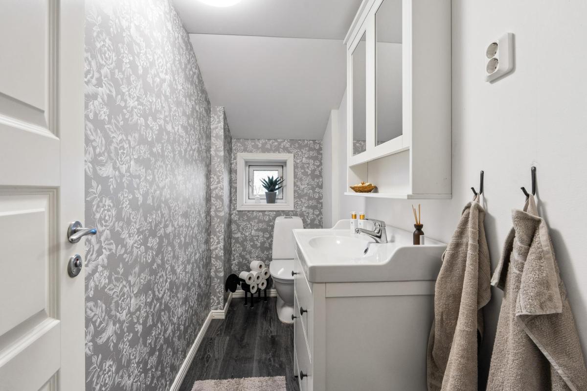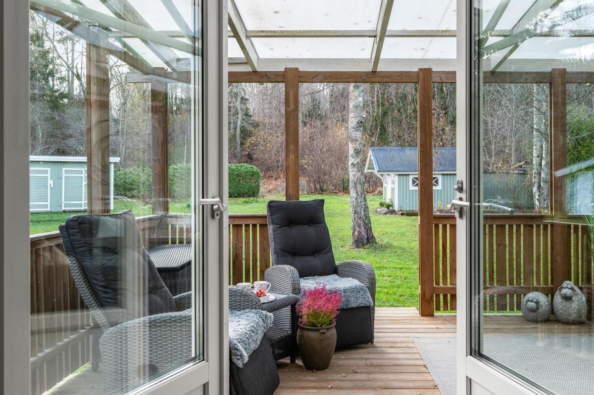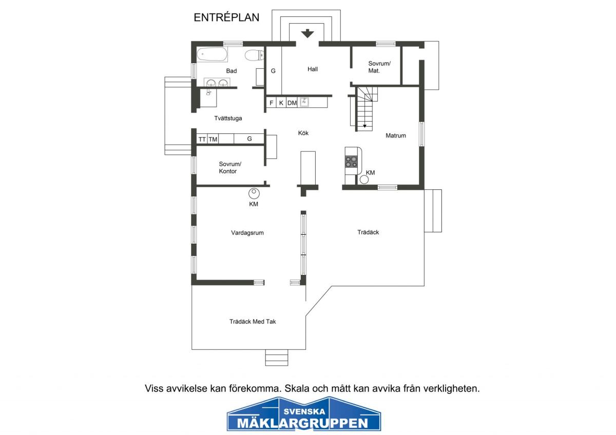 Vardagsrummet är rymligt, med braskamin och ytterligare pardörrar som leder ut till en mysig veranda under tak. På entréplan finns även ett helkaklat badrum med badkar, dubbla handfat och WC, samt en stor tvättstuga med dusch, tvättmaskin, torktumlare och en utgång till husets sida. Intill köket finns ett extra rum som kan användas som sovrum, kontor eller varför inte ett lyxigt skafferi.