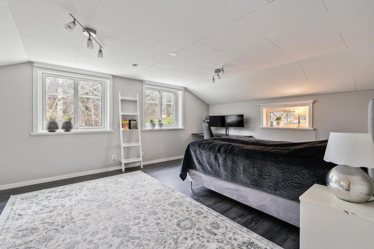 Ett rymligt sovrum med fönster i tre väderstreck – perfekt som master bedroom eller kreativt arbetsrum.