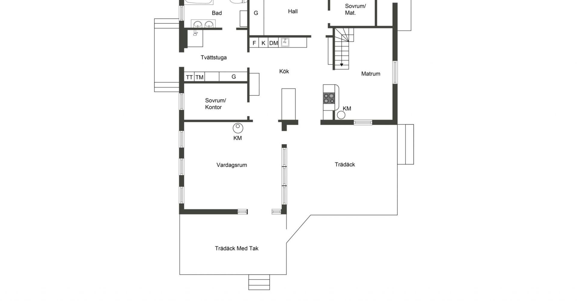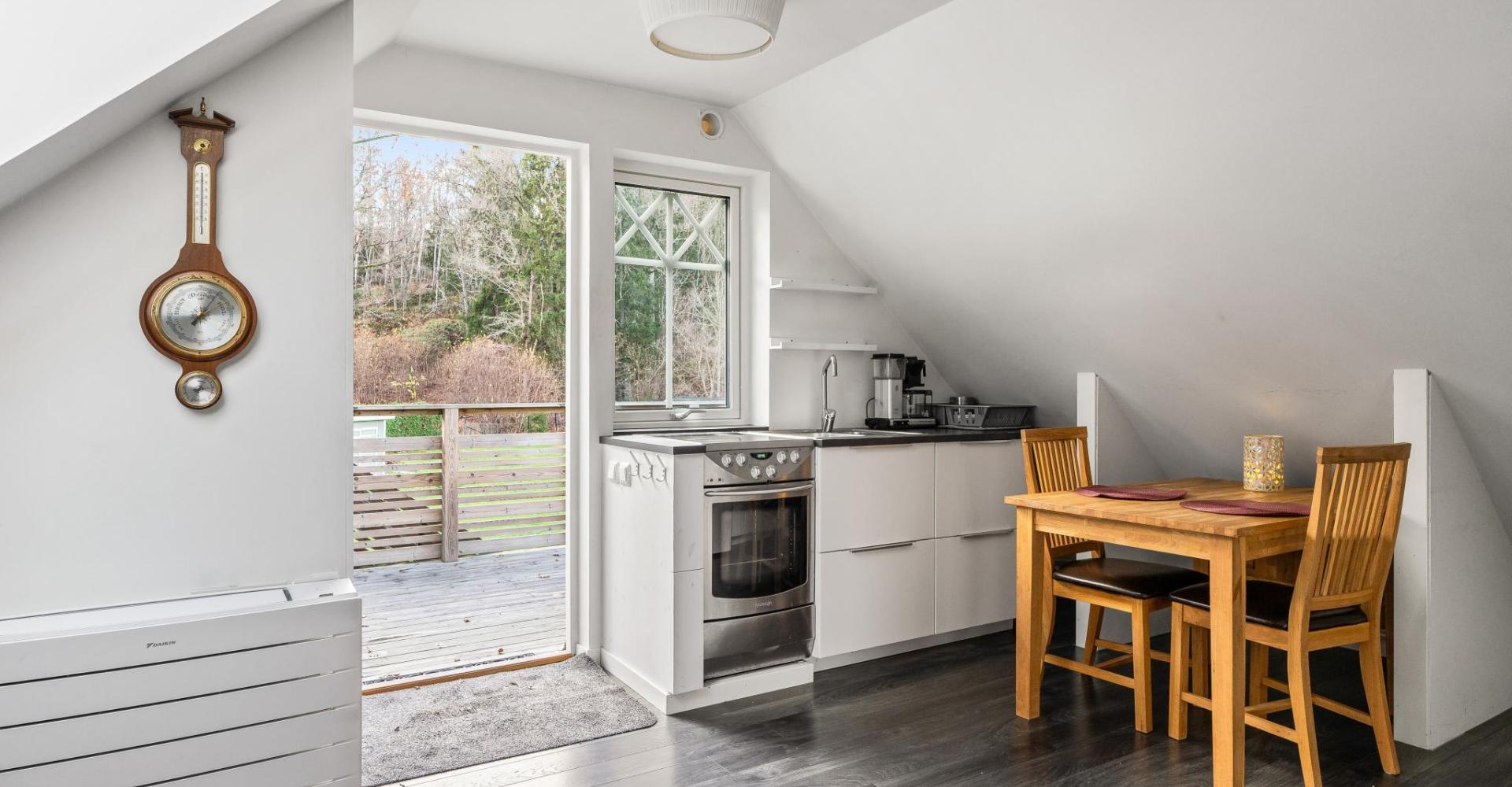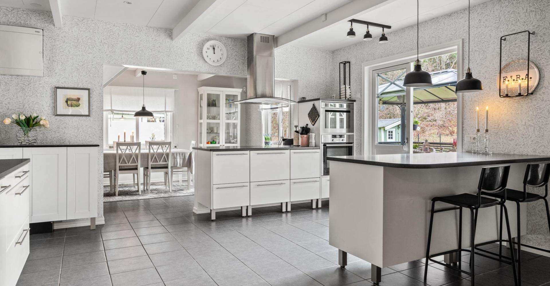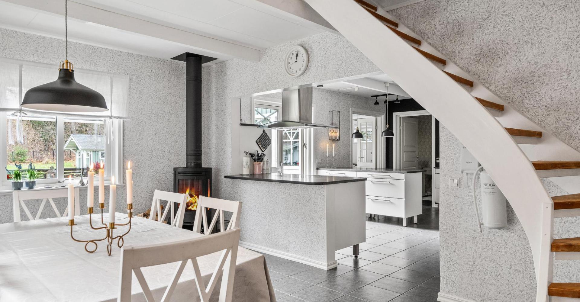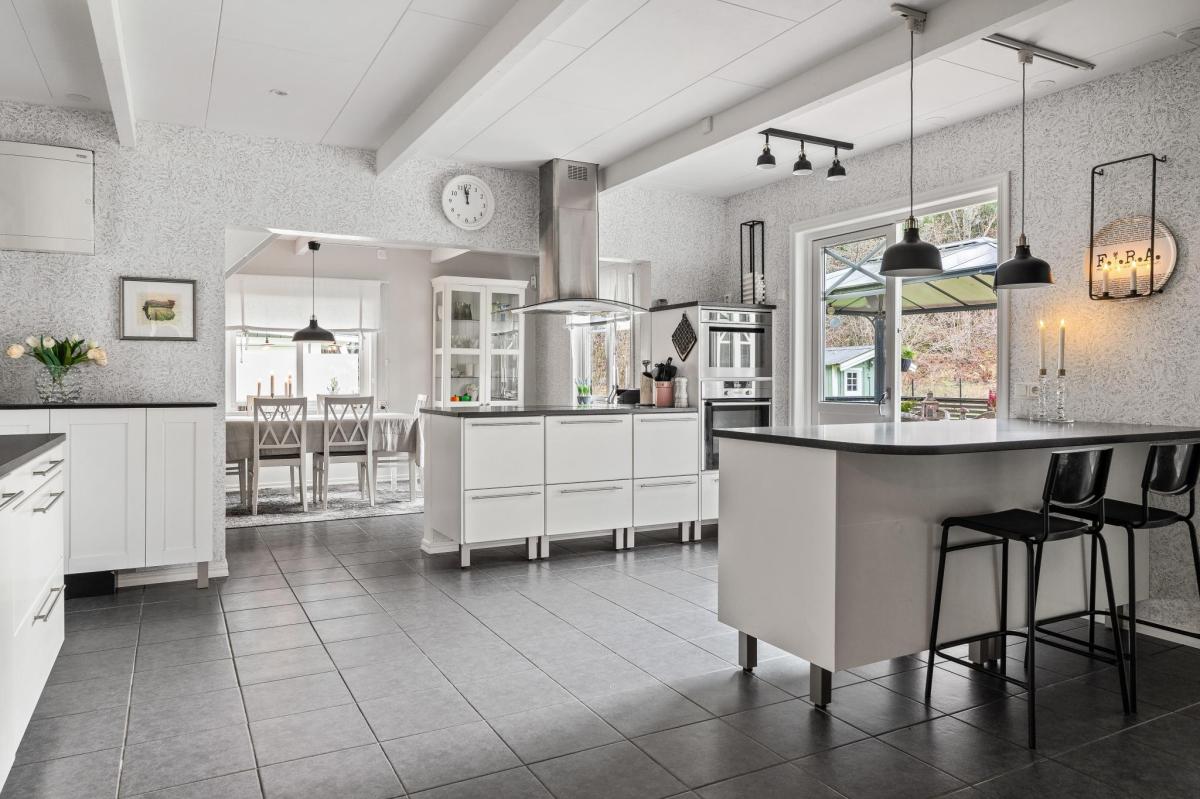 Husets hjärta är det stilfulla köket från Puustelli, totalrenoverat 2012, med vit inredning, svart klinkergolv och en inbjudande matplats med braskamin. Här finns rostfri kyl och frys i fullhöjd, diskmaskin, inbyggnadsugn och spishäll – allt du behöver för att laga och njuta av goda middagar. Från köket öppnar pardörrar upp mot ett stort trädäck i soligt sydvästläge – perfekt för sommarens grillkvällar. På trädäcket finns en stor pergola 3 x 4 meter. Det finns även två oanvända grå tygväggar till pergolan.