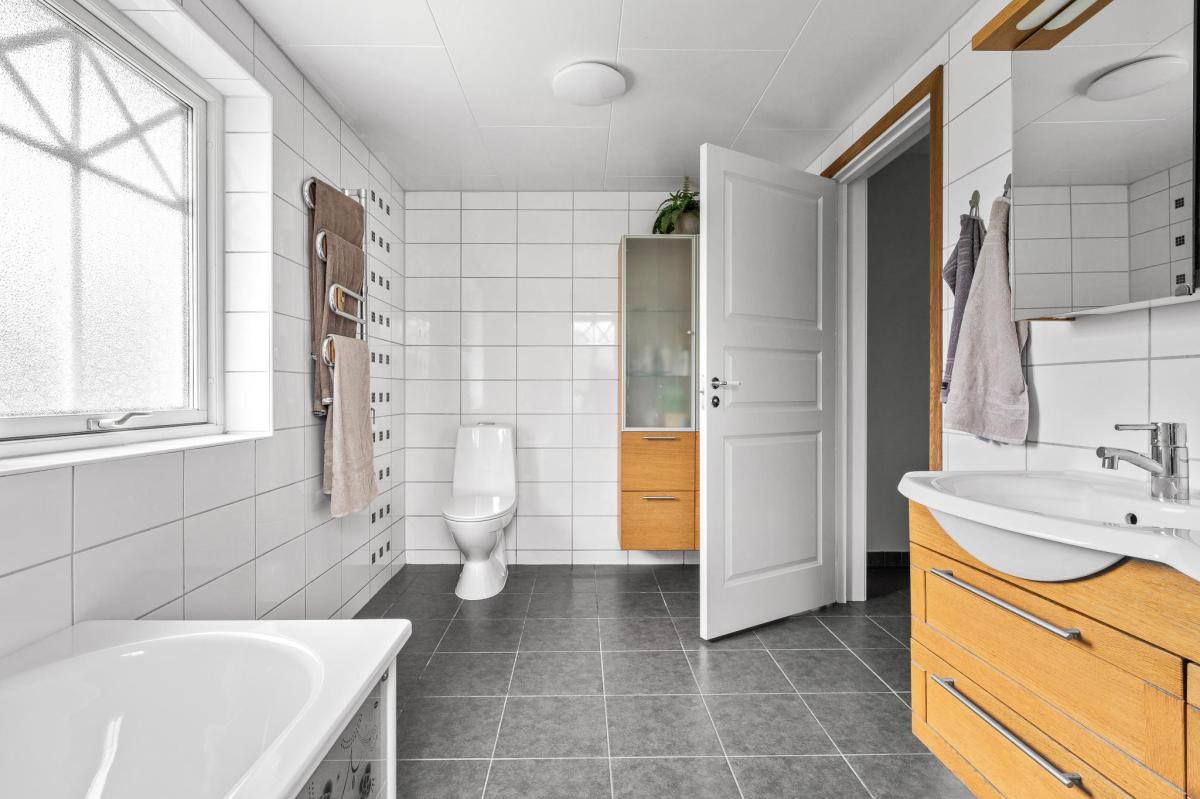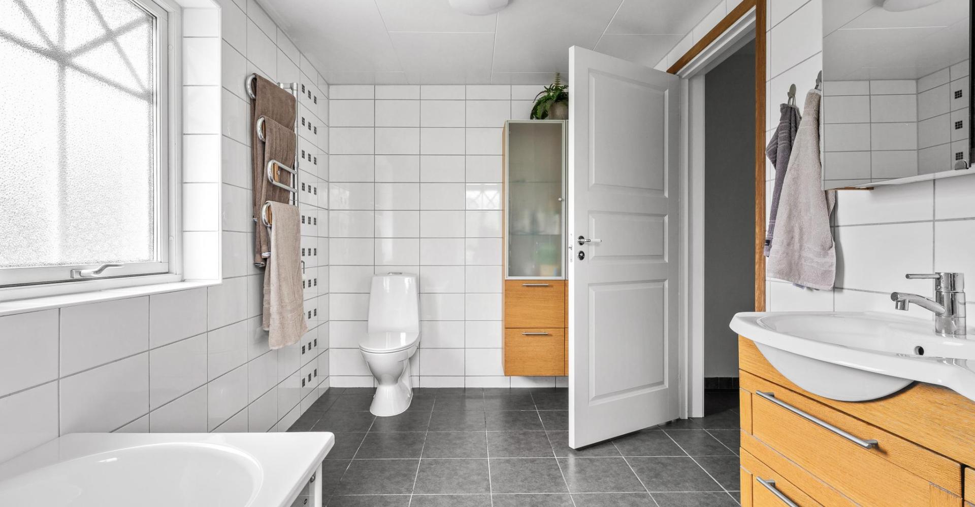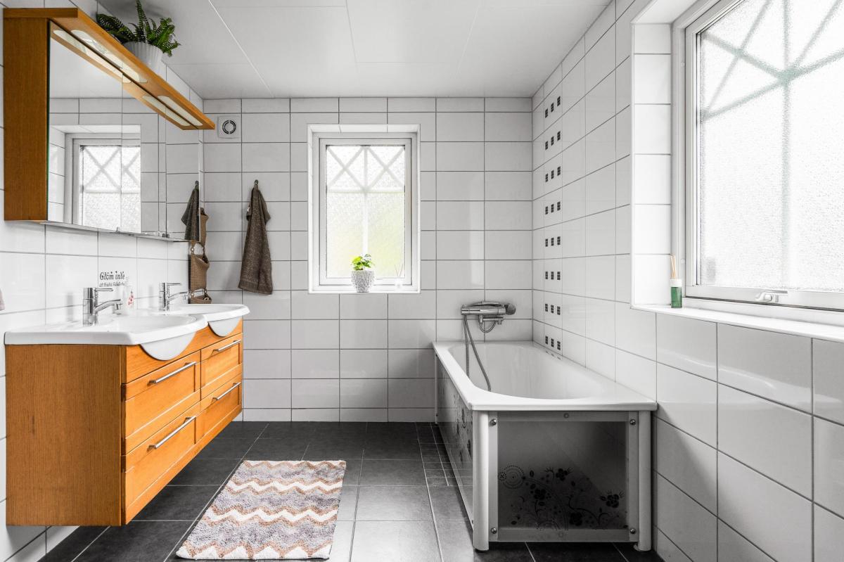 Stilrent badrum med kakel och klinker, utrustat med WC, badkar och dubbla handfat – perfekt för både vardag och avkoppling. Eluppvärmd handdukstork.