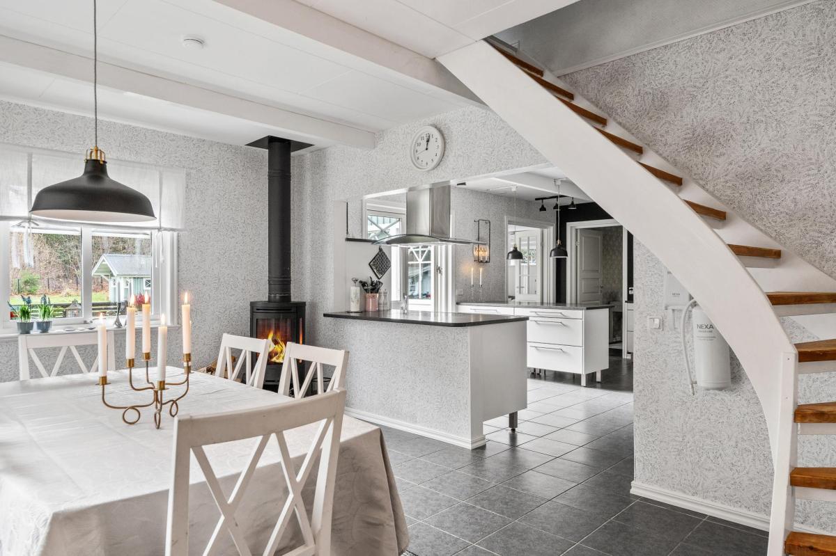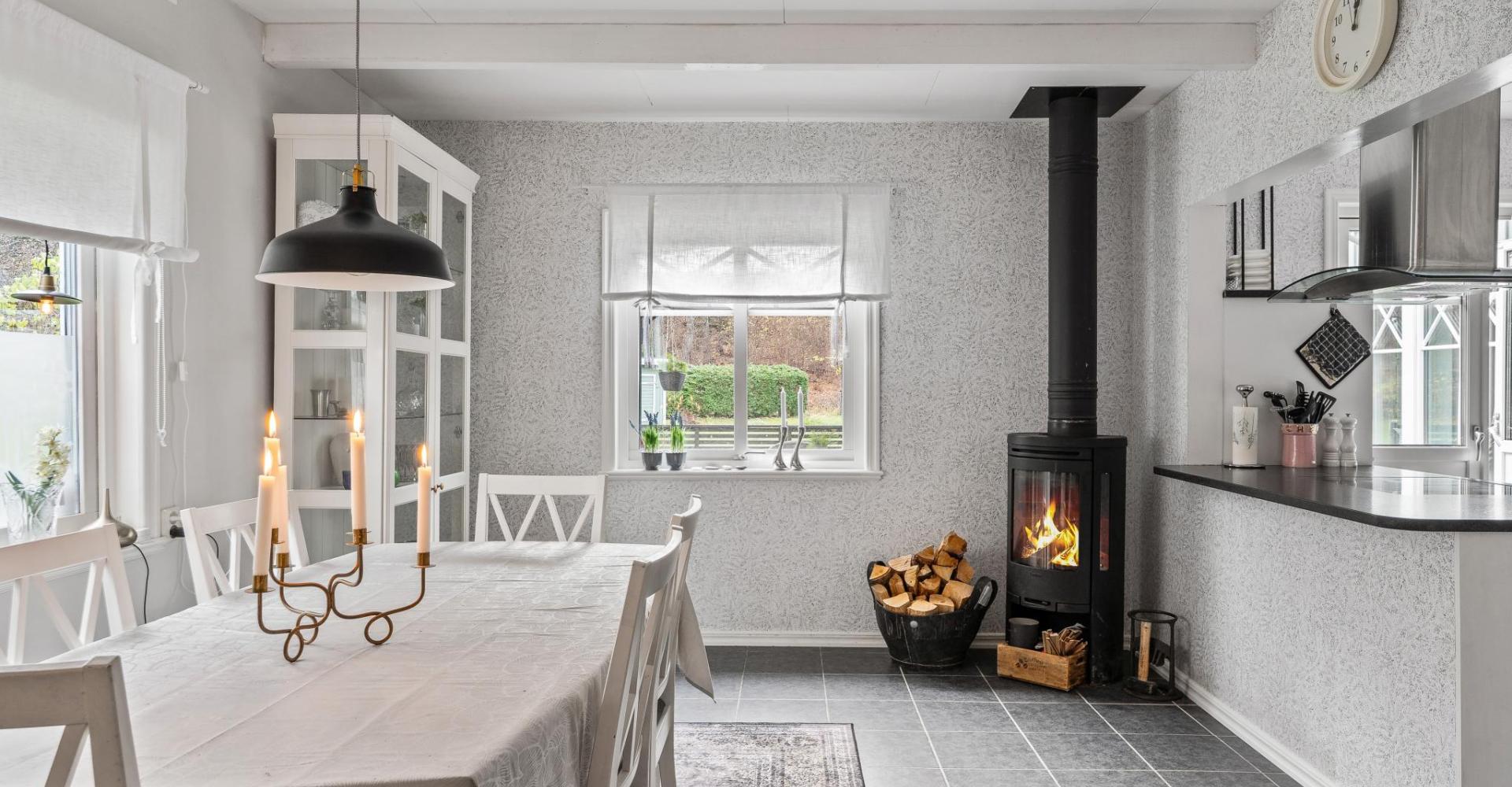 Kökets klinkergolv, braskamin och luft/luftvärmepump skapar både stil och komfort. Här finns spishäll, inbyggnadsugn, mikro, diskmaskin, stor diskho i rostfritt och gott om förvaring. Spotlights i taket ger ett modernt intryck. (Observera att köksfläkten behöver ses över enligt säljaren.)