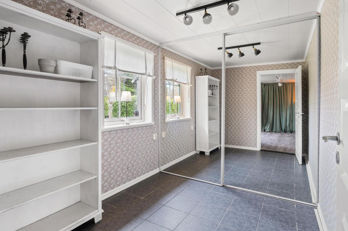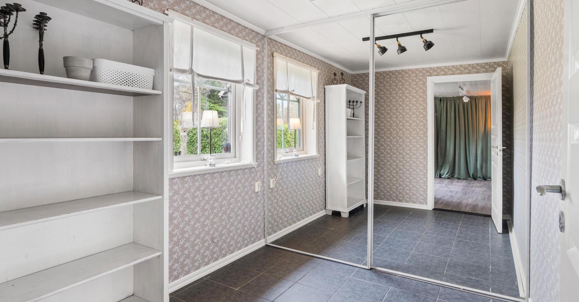 Redan vid entrén möts du av eleganta pardörrar som leder in till en generös hall med utmärkt förvaring. Intill hallen finns ett mångsidigt rum som passar lika bra som sovrum, hemmakontor eller klädkammare – med egen utgång till husets sida.