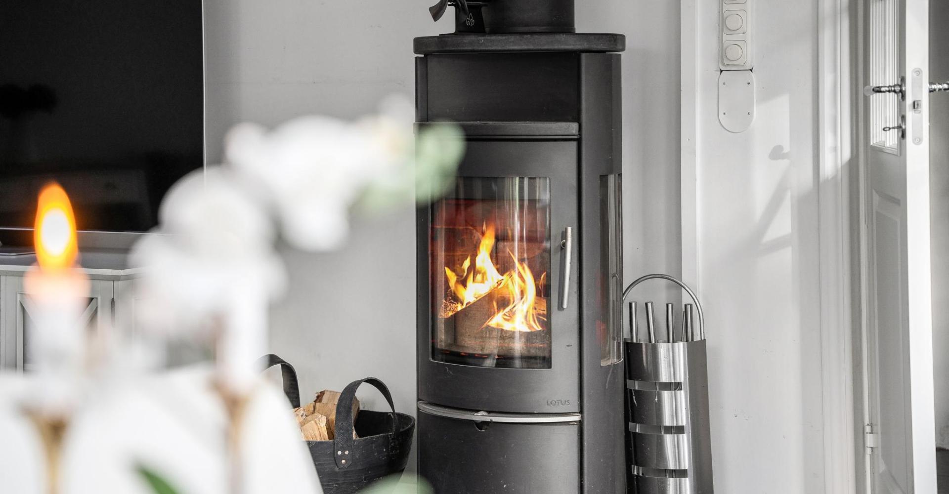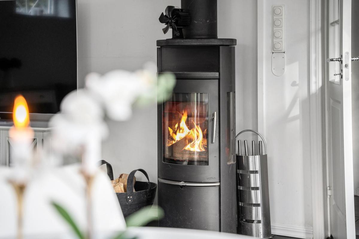 Ett inbjudande vardagsrum med parkettgolv, tapetserade väggar, braskamin och luft/luftvärmepump. Spotlights i taket skapar en varm och trivsam atmosfär.