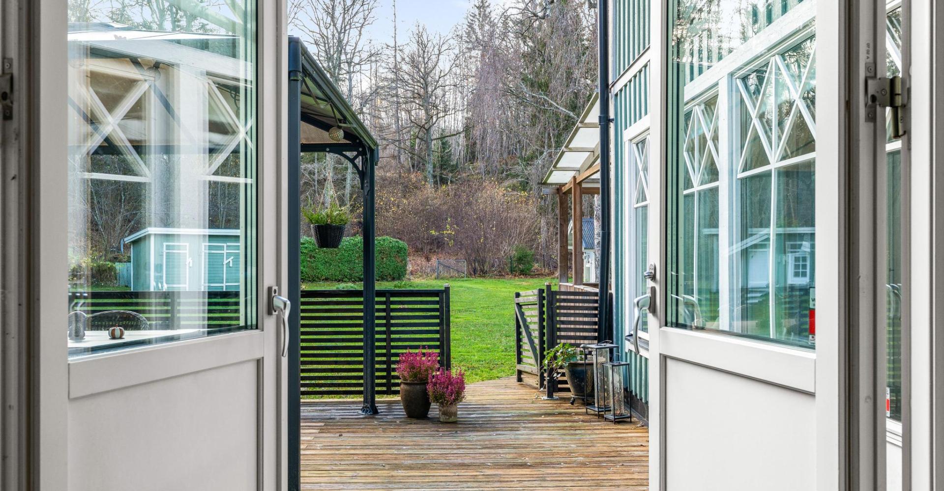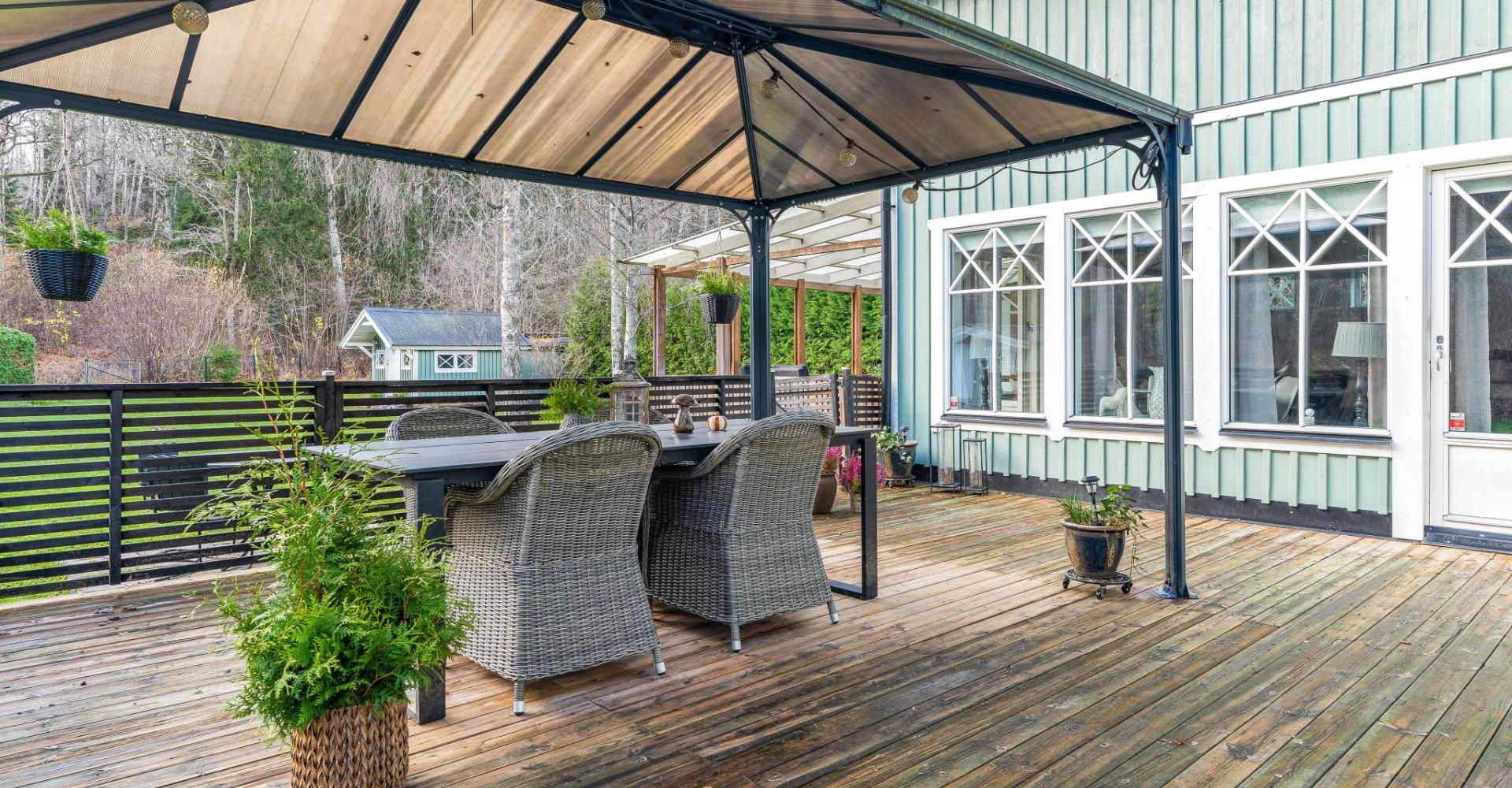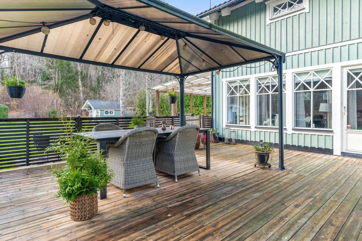 Utanför köket finns ett stort, härligt trädäck, som är ett extra vardagsrum på sommaren. En helt privat oas för dig själv och familjen.