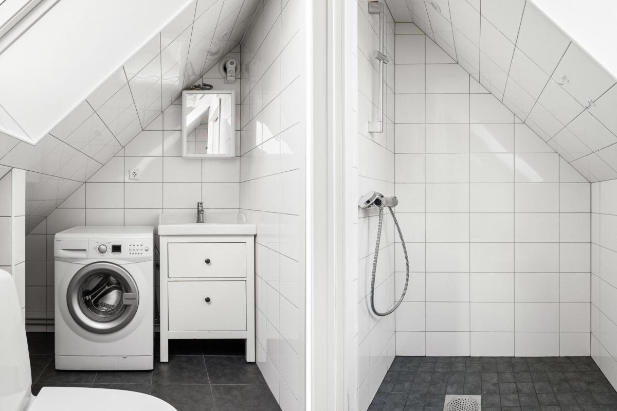 Tvättmaskin, dusch och WC. Takfönster för bra ljusinsläpp.