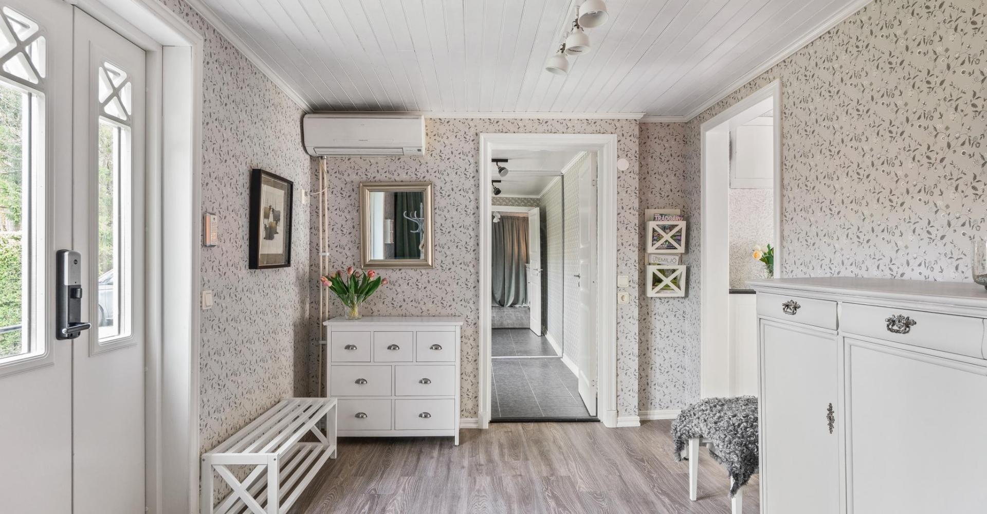 Laminatgolv (Pergogolv) och tapetserade väggar leder vidare till hemmets mer privata delar.