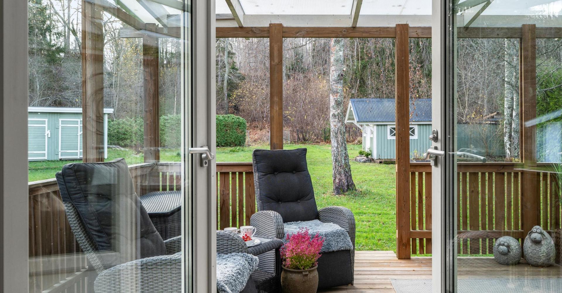 Pardörrar ut från vardagsrummet till trädäck under tak