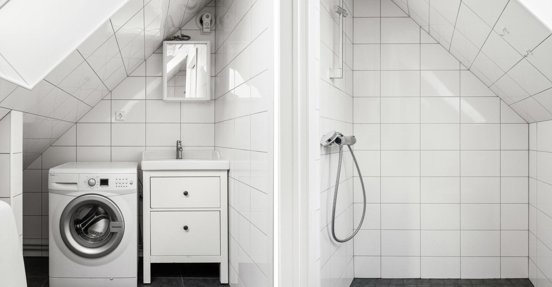 Kakel och klinker, tvättmaskin, torktumlare och dusch gör detta till en komplett tvättstuga. Bra förvaringslösningar och spotlights i taket. Eluppvärmd handdukstork.