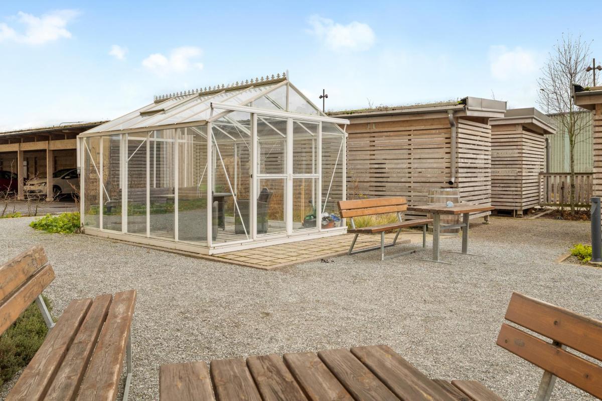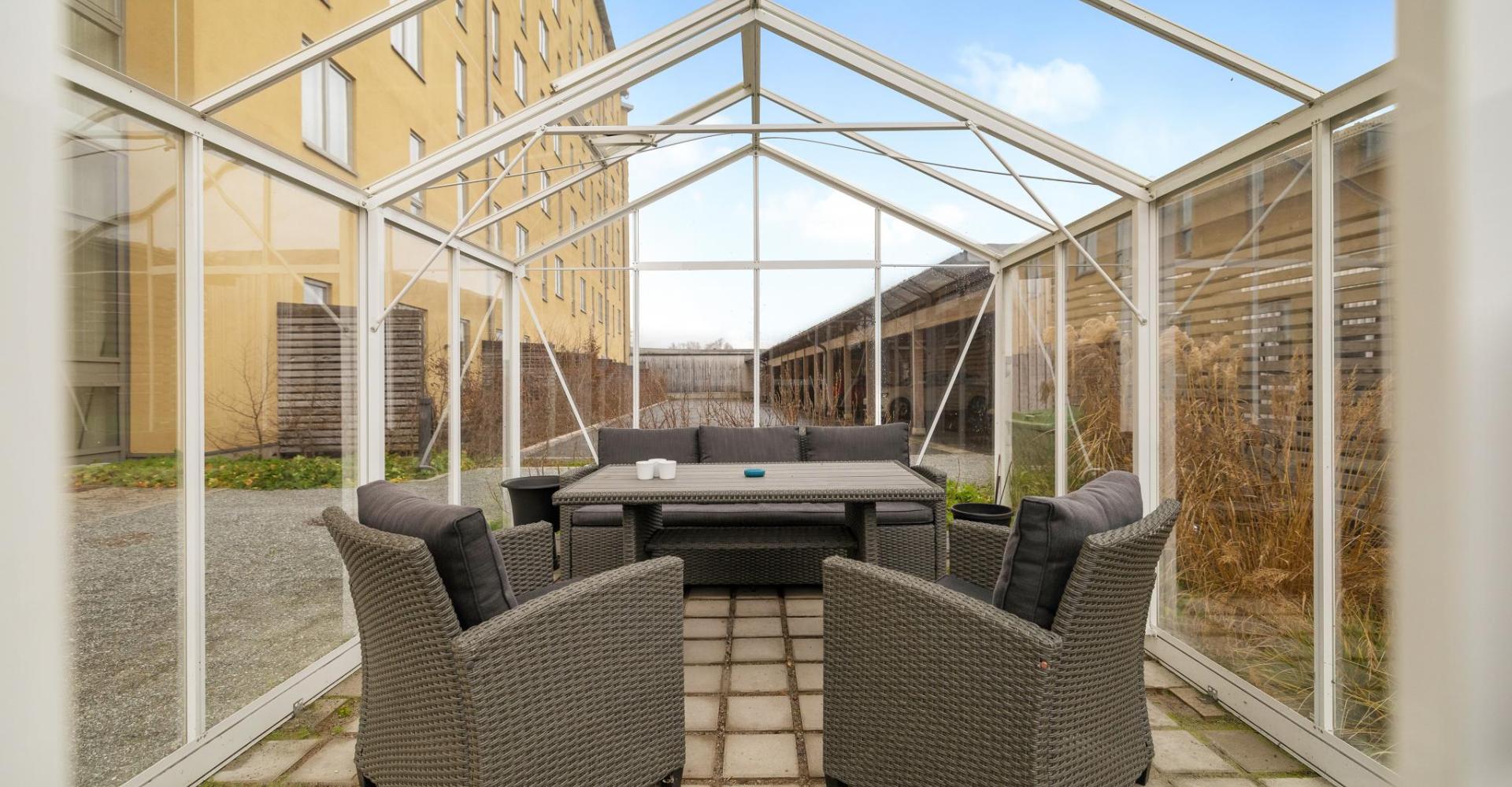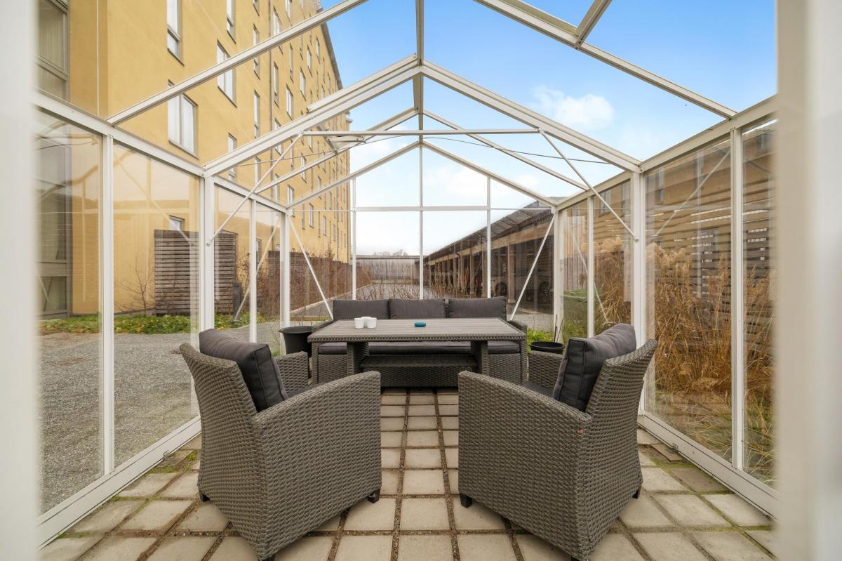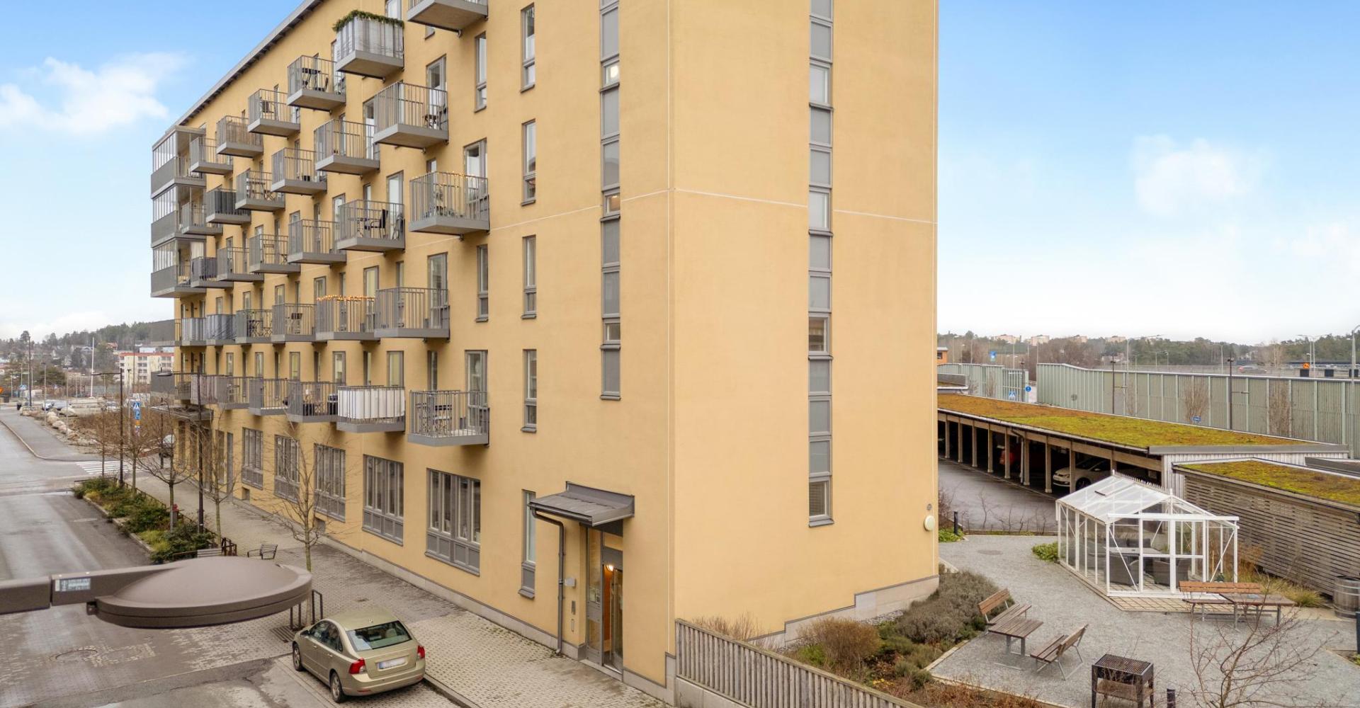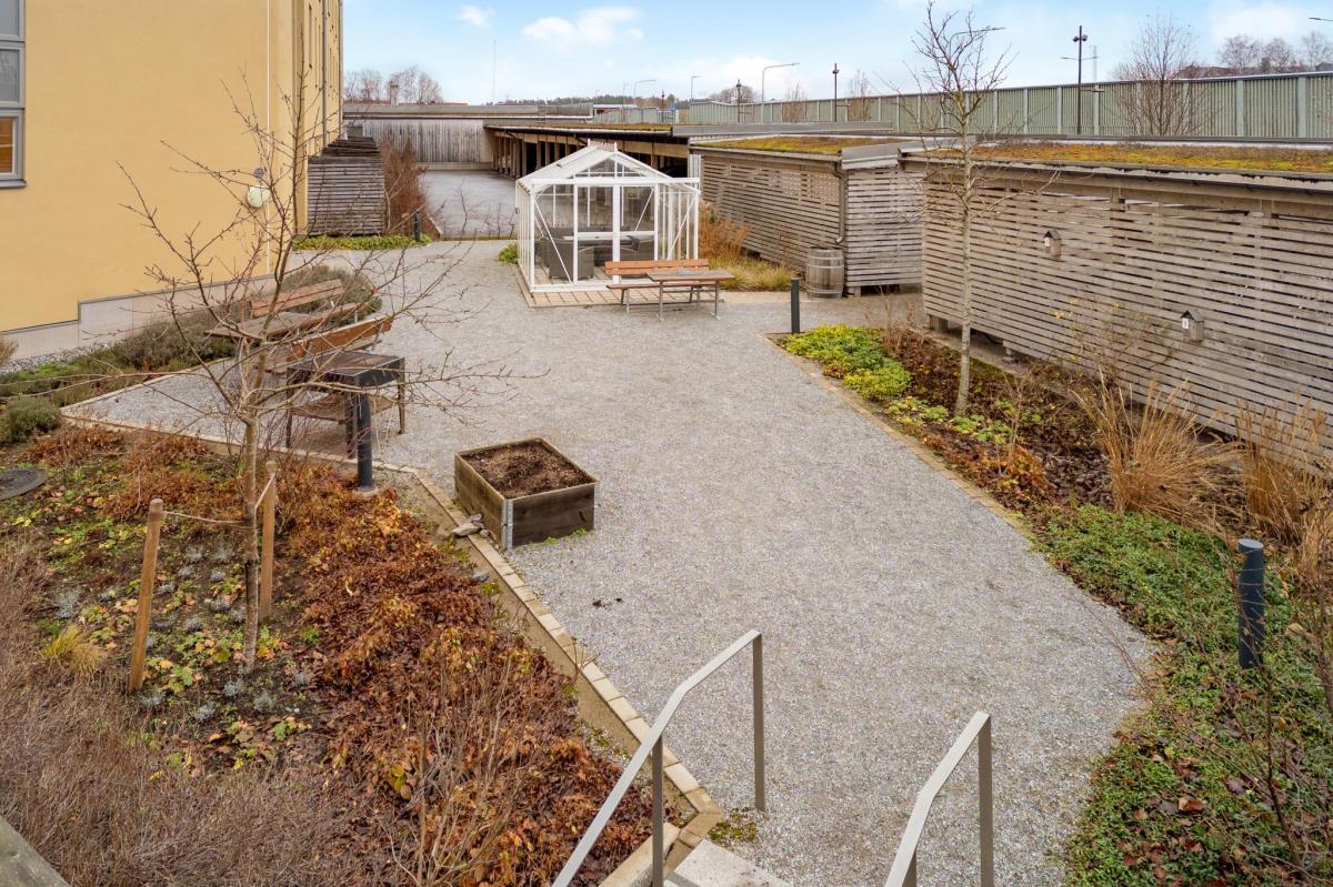 Lägenheten ligger strategiskt mycket bra i huset som självklart har hiss. Fin trädgård med växthus, på taket finns en takterrass med fin vy över Täby.
