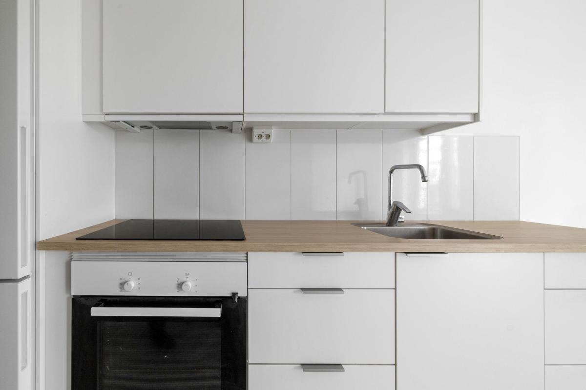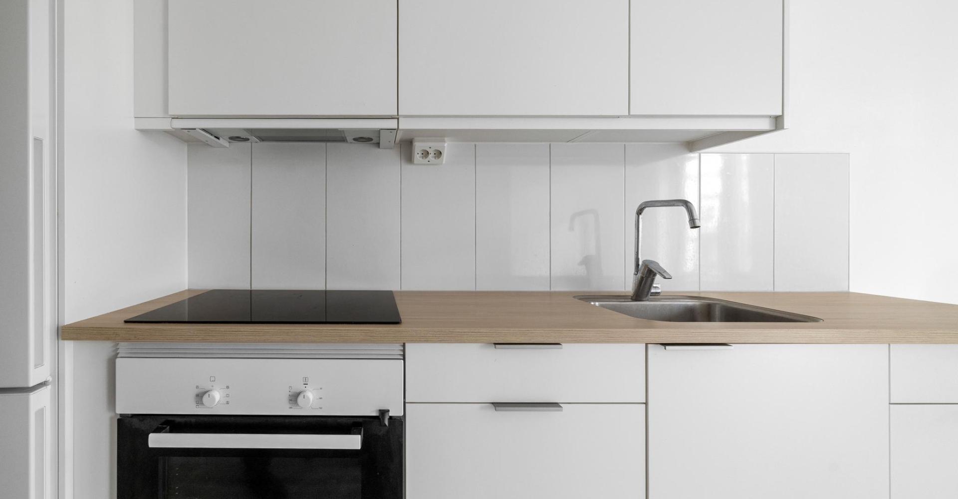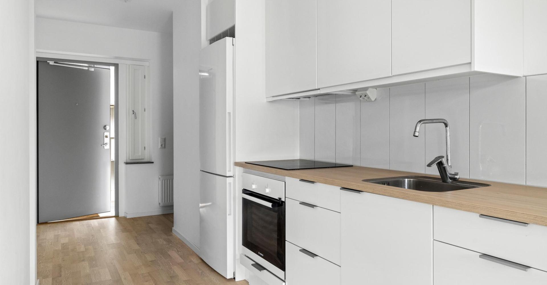 Kök med vit pigmenterad 3-stav ekgolv, målade väggar, köksinredning från Marbodal med vita luckor , vitt kakel ovan bänk. Städskåp.