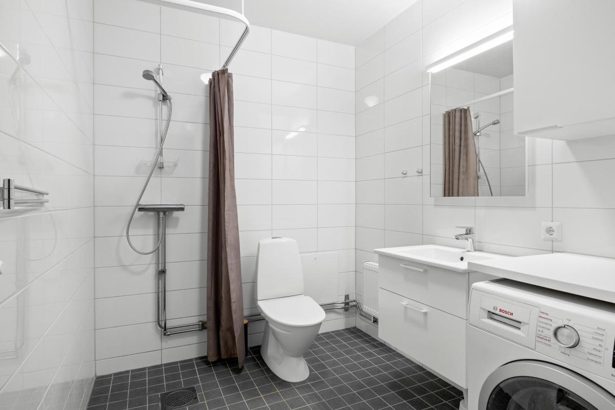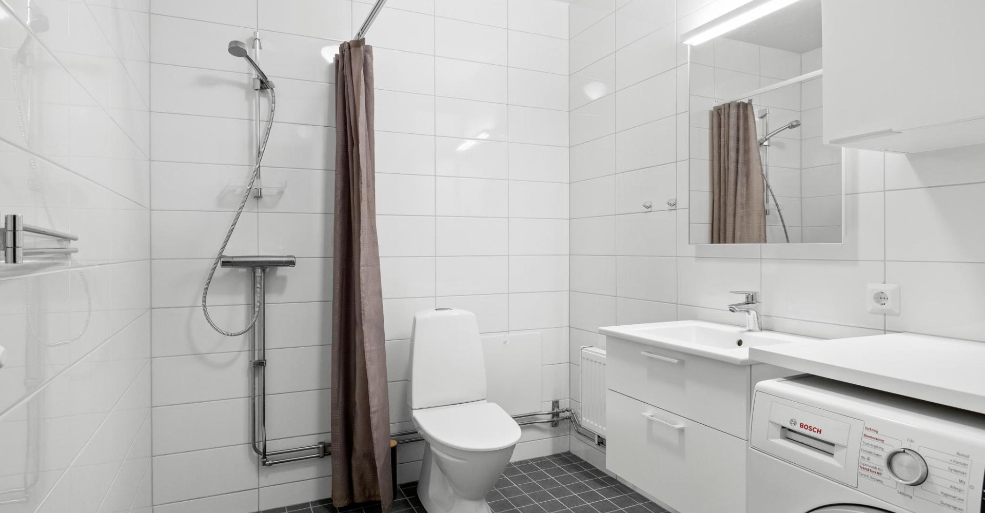Badrummet är utrustat med w.c., handfat i kommod, spegel med LED-belysning. dusch, kombinerad tvätt/torktumlare samt vitt skåp ovan.