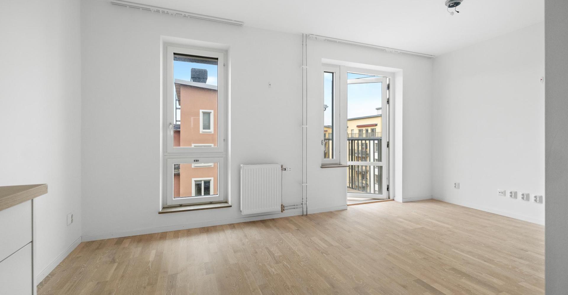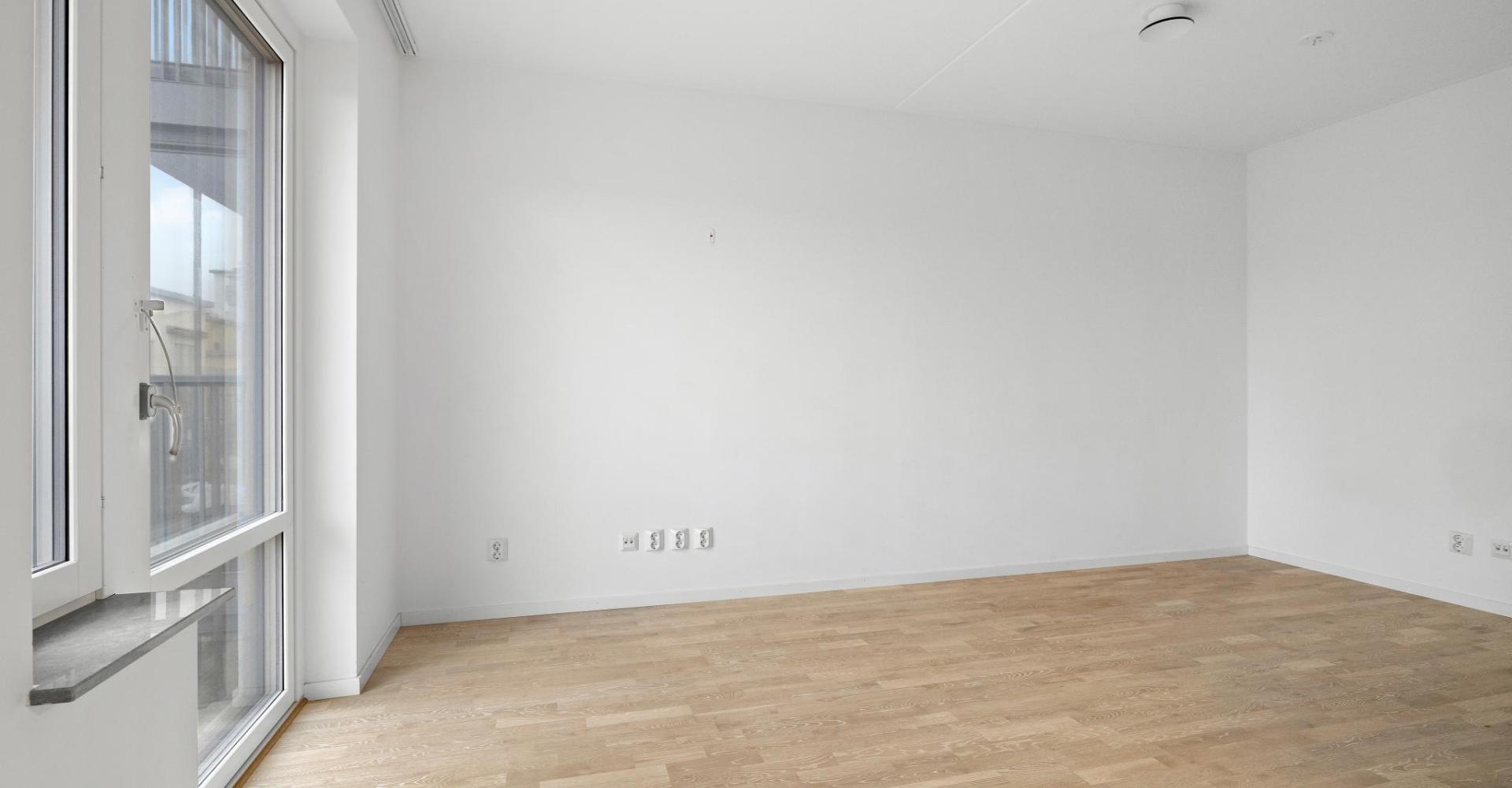 Vardagsrum med vit pigmenterad 3-stav,ekgolv, målade väggar samt utgång till balkong.