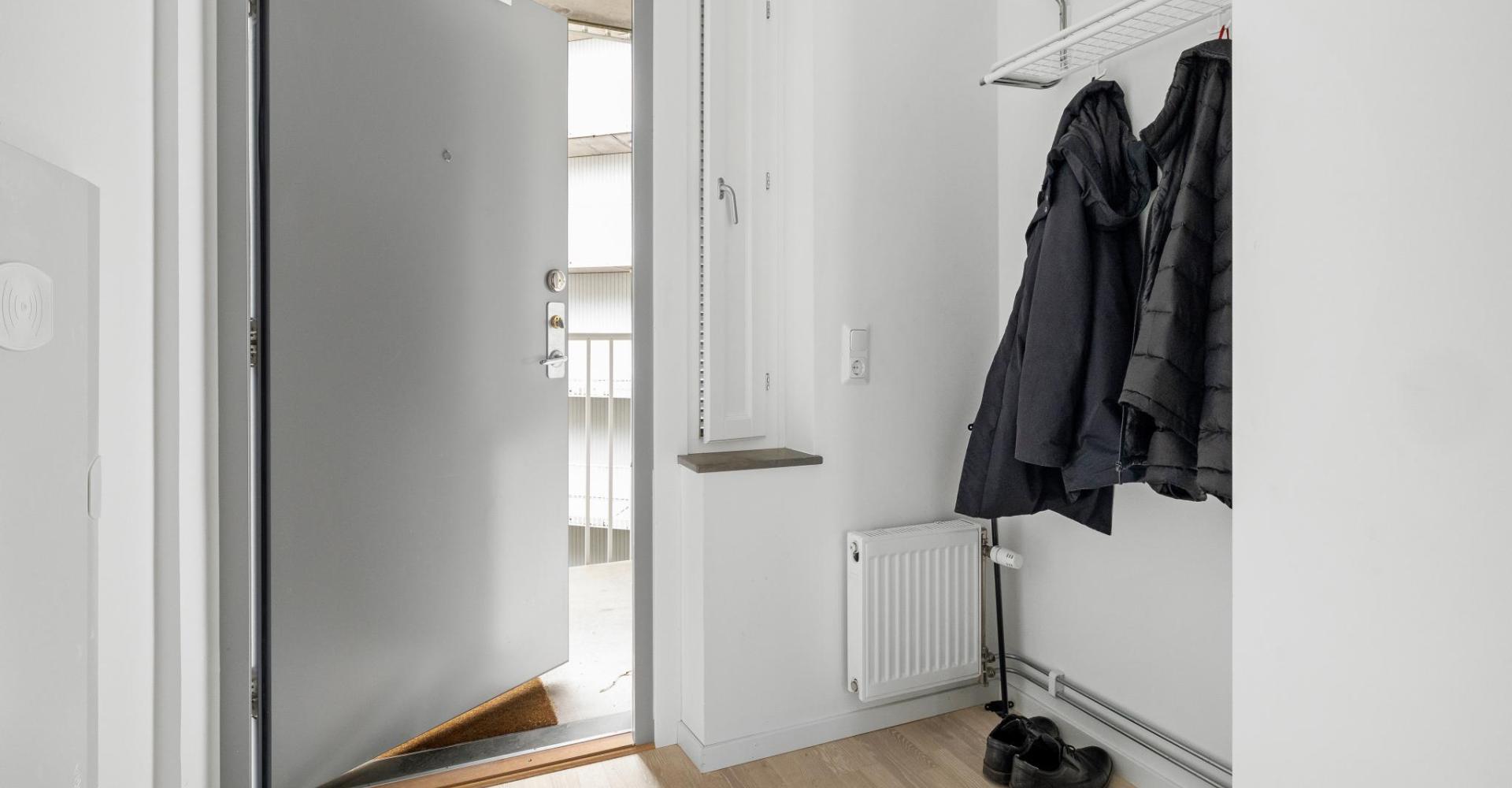Hall med vit pigmenterad 3-stav,ekgolv samt målade väggar, hatthylla.