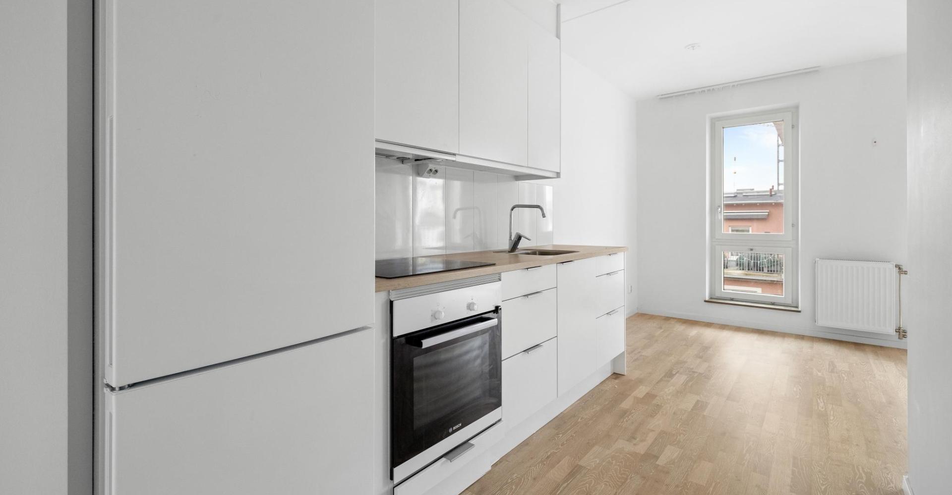 Köket är utrustat med induktionshäll Bosch, separat ugn Bosch, spisfläkt Franke, kyl/frys Bosch.