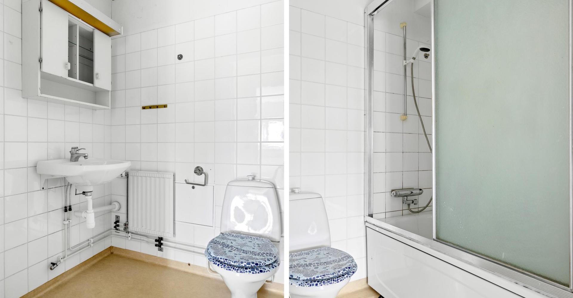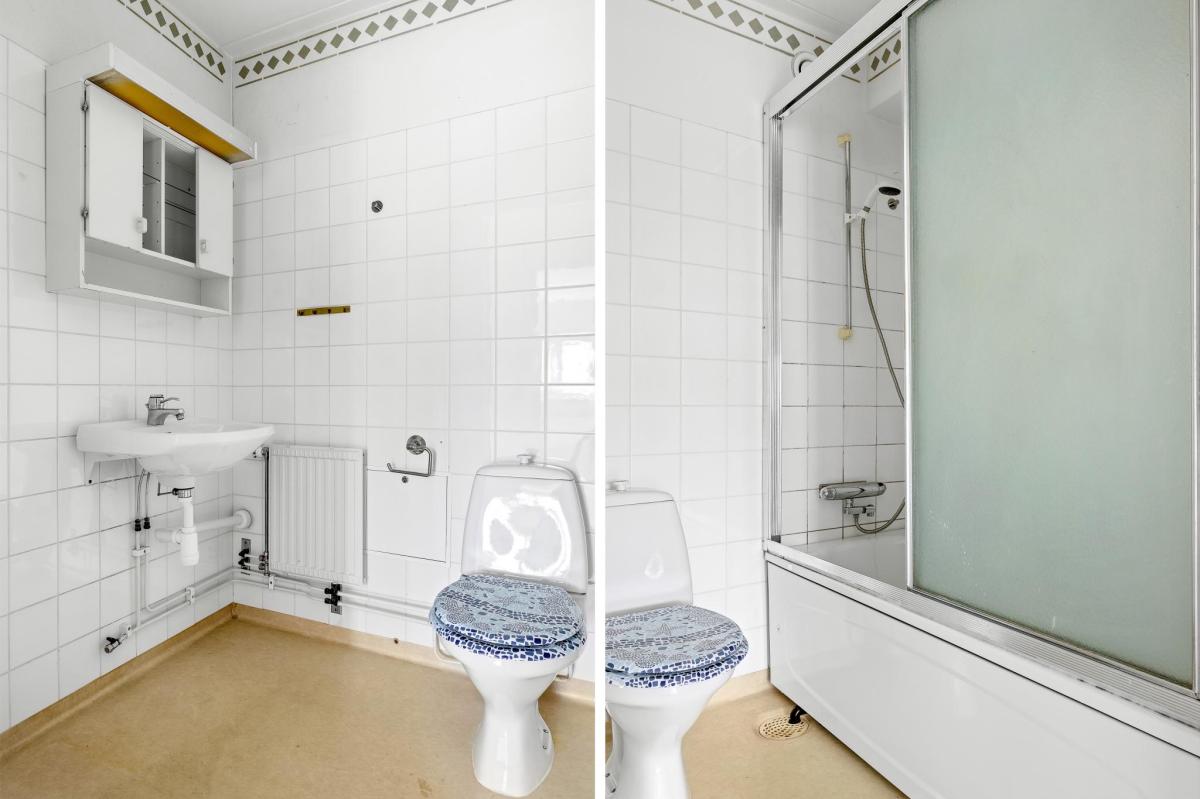 Badrum med plastmatta samt 7/8 -kaklat. Badrummet är utrustat med w.c., handfat, badrumsskåp med belysning samt badkar.
