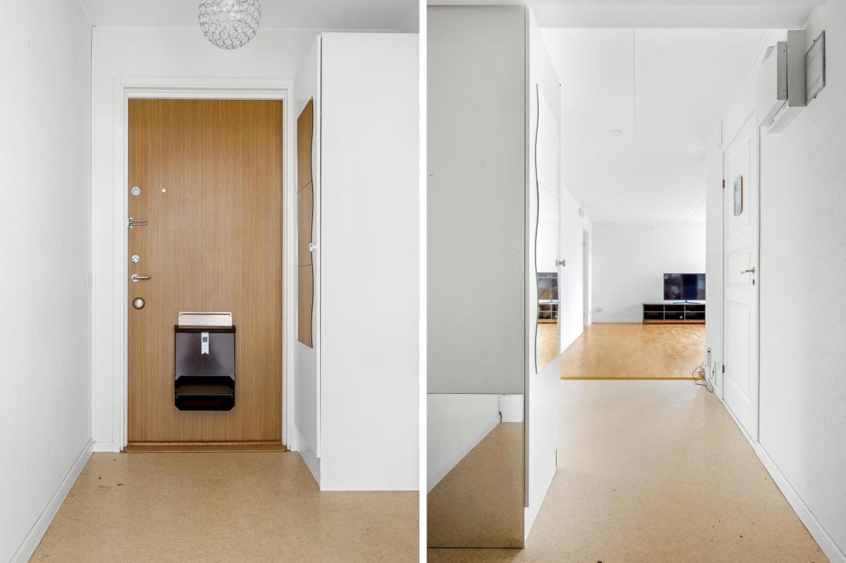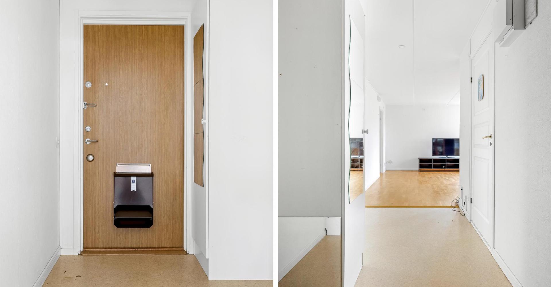 Hall med plastmatta, målade väggar samt 2 garderober.