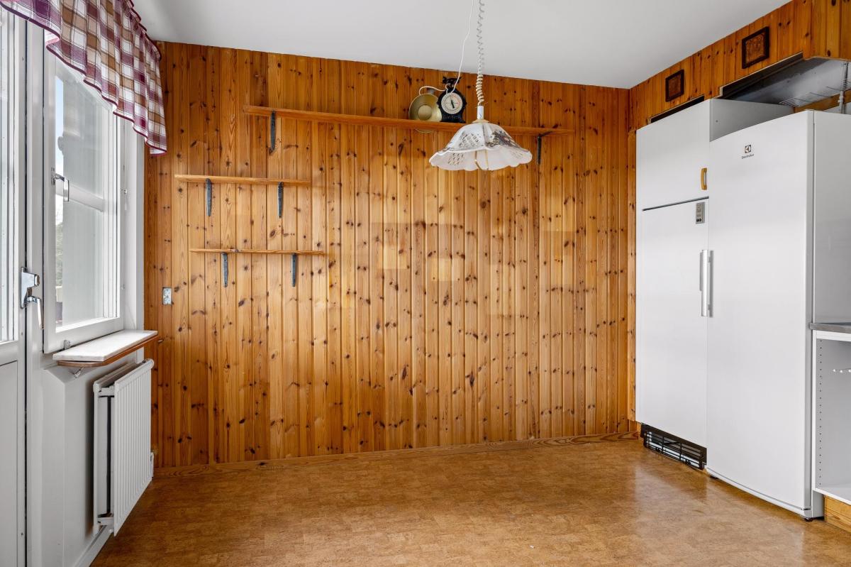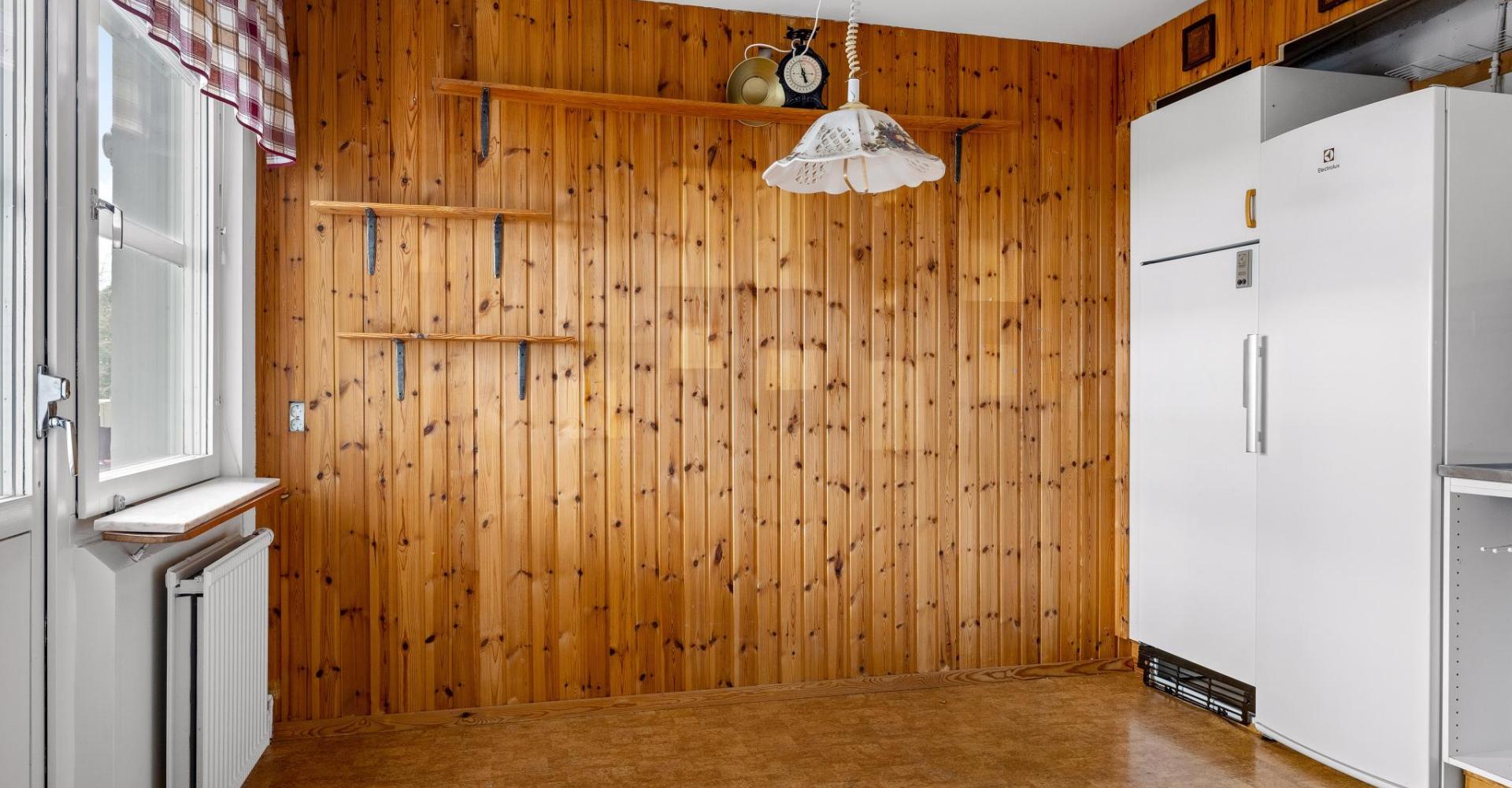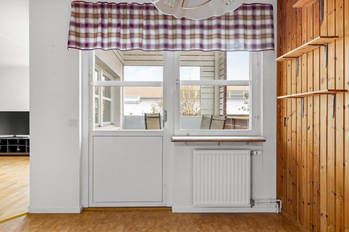 Kök med plastmatta samt panel på vägg och utgång till balkong. Köket är utrustat med spis med häll, spisfläkt, kyl, frys samt diskmaskin.