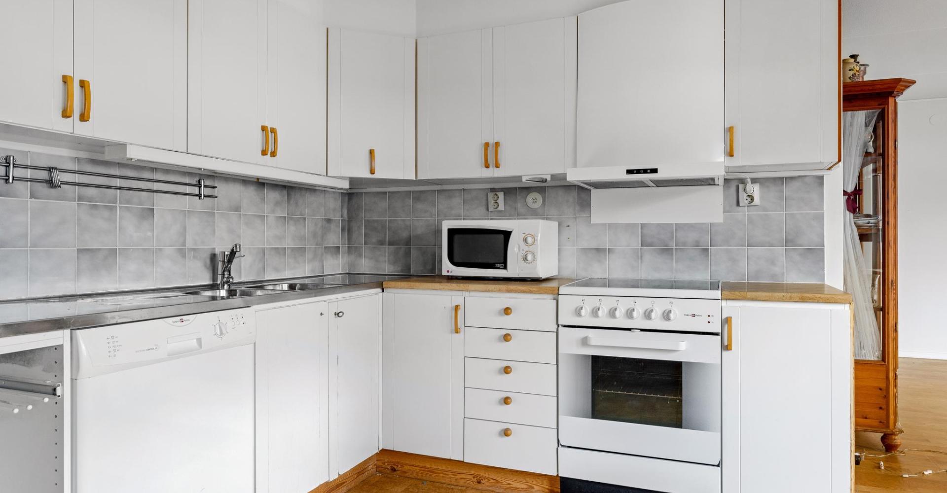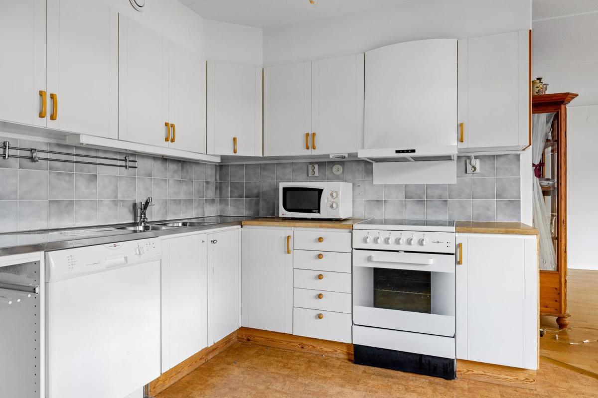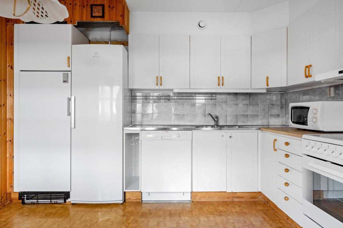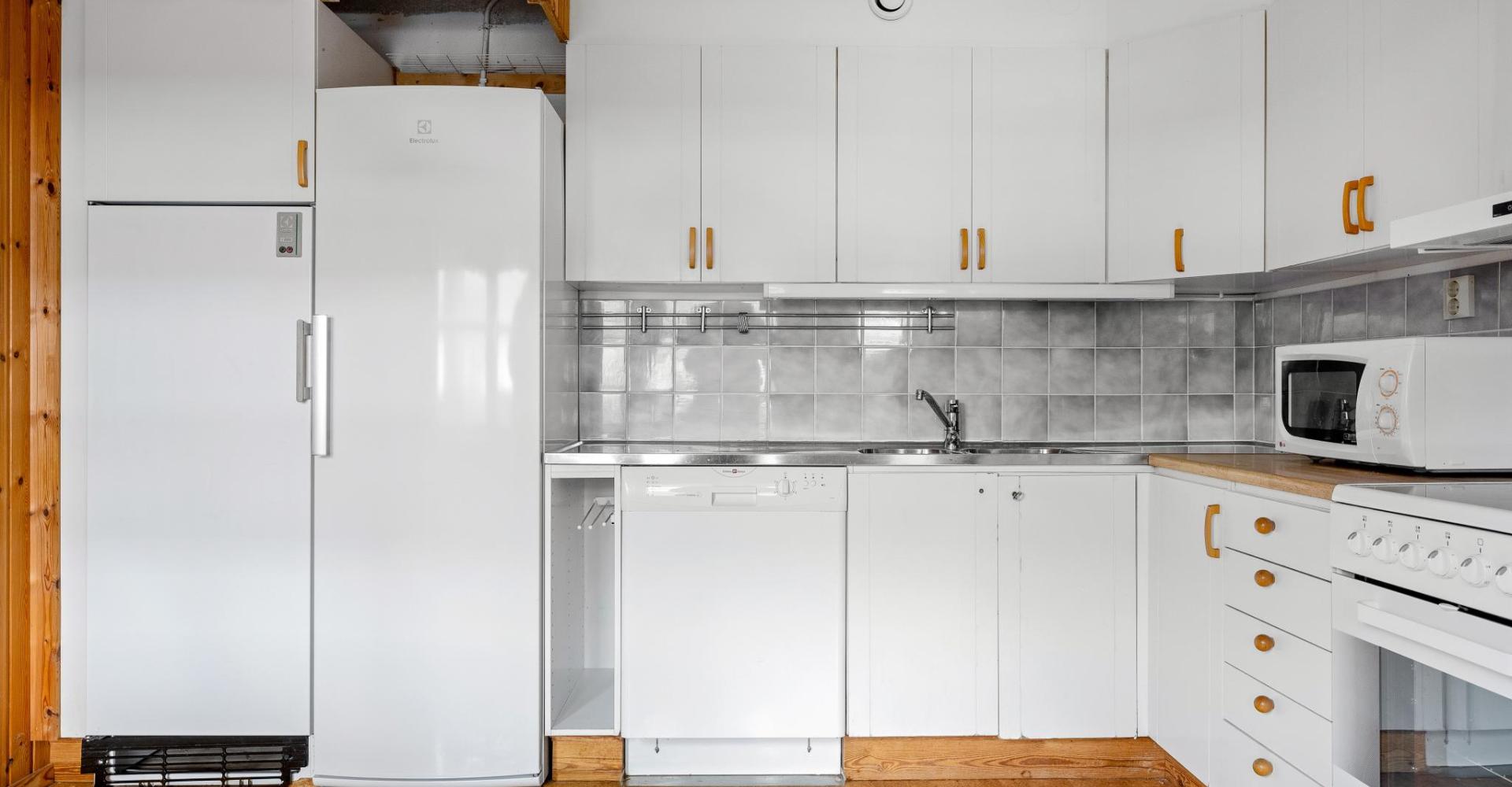 Kök med plastmatta samt panel på vägg och utgång till balkong. Köket är utrustat med spis med häll, spisfläkt, kyl, frys samt diskmaskin.