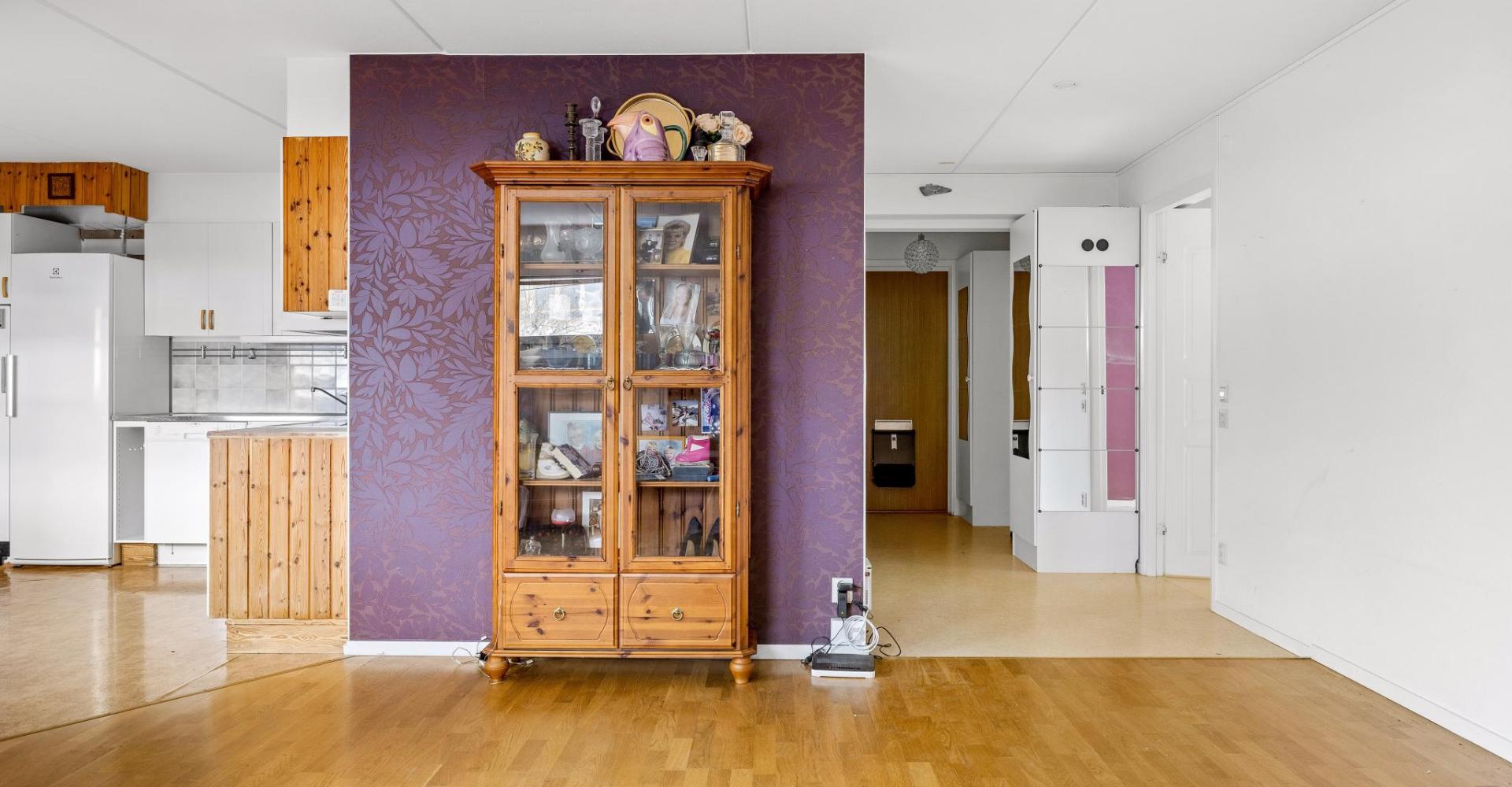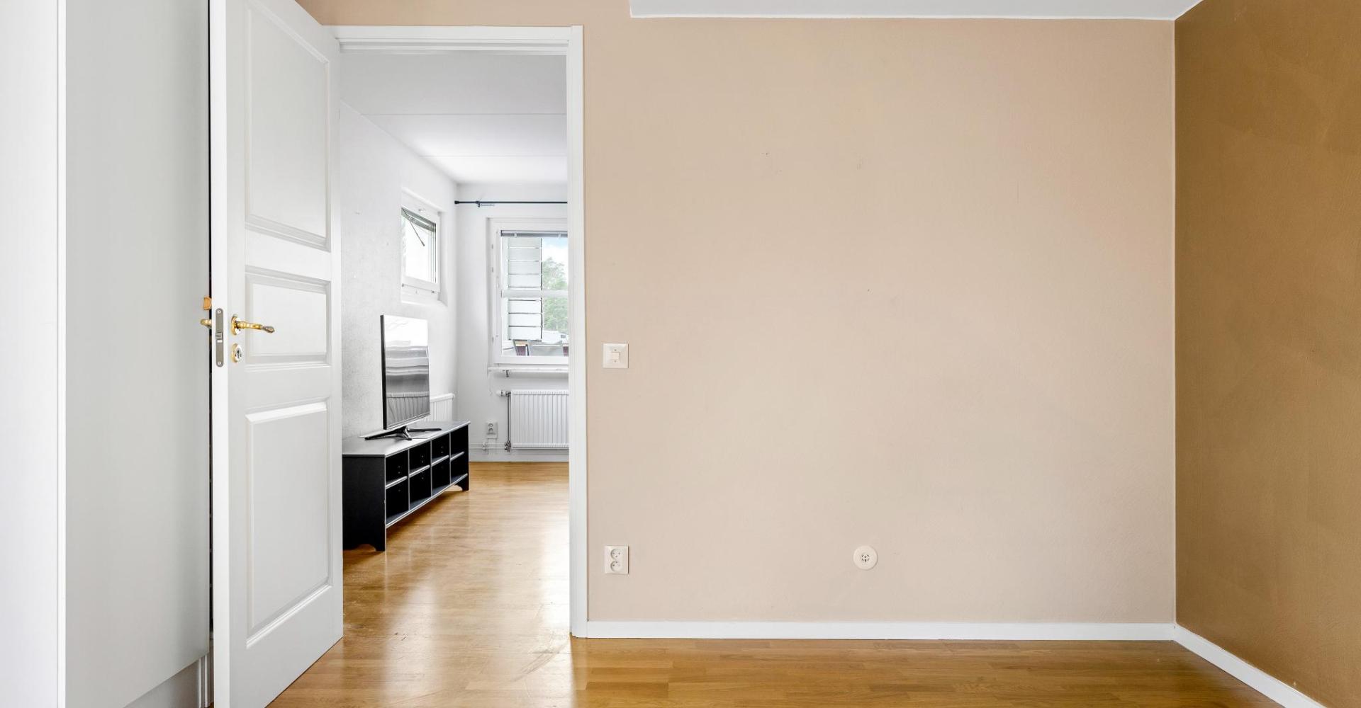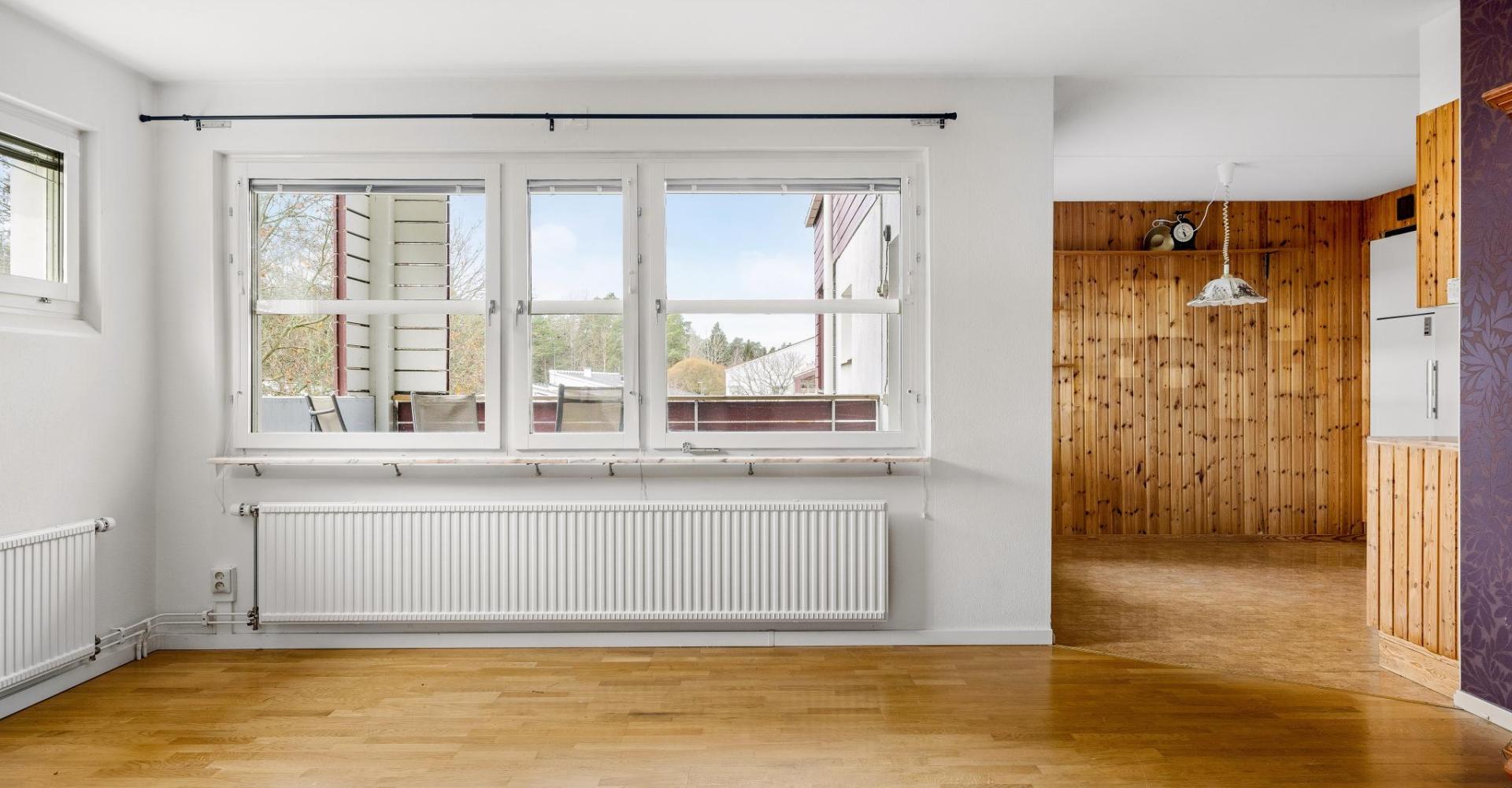 Vardagsrum med ekparkettgolv samt målade väggar.