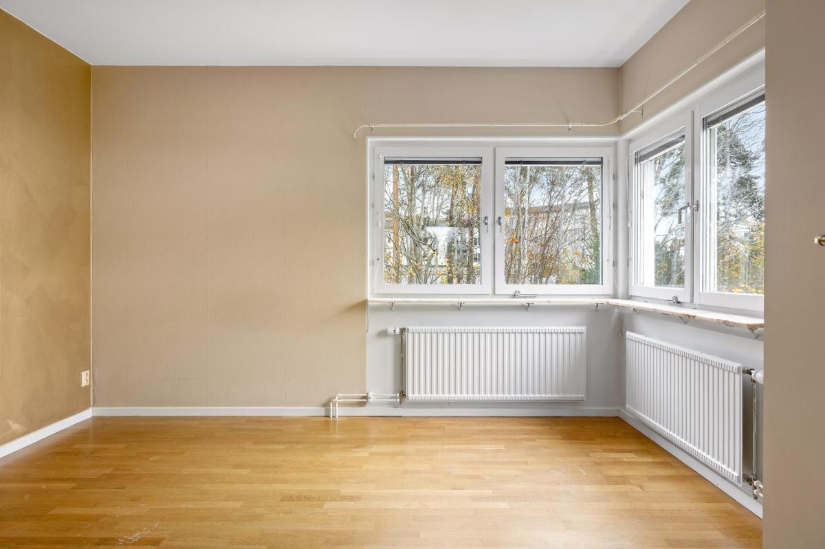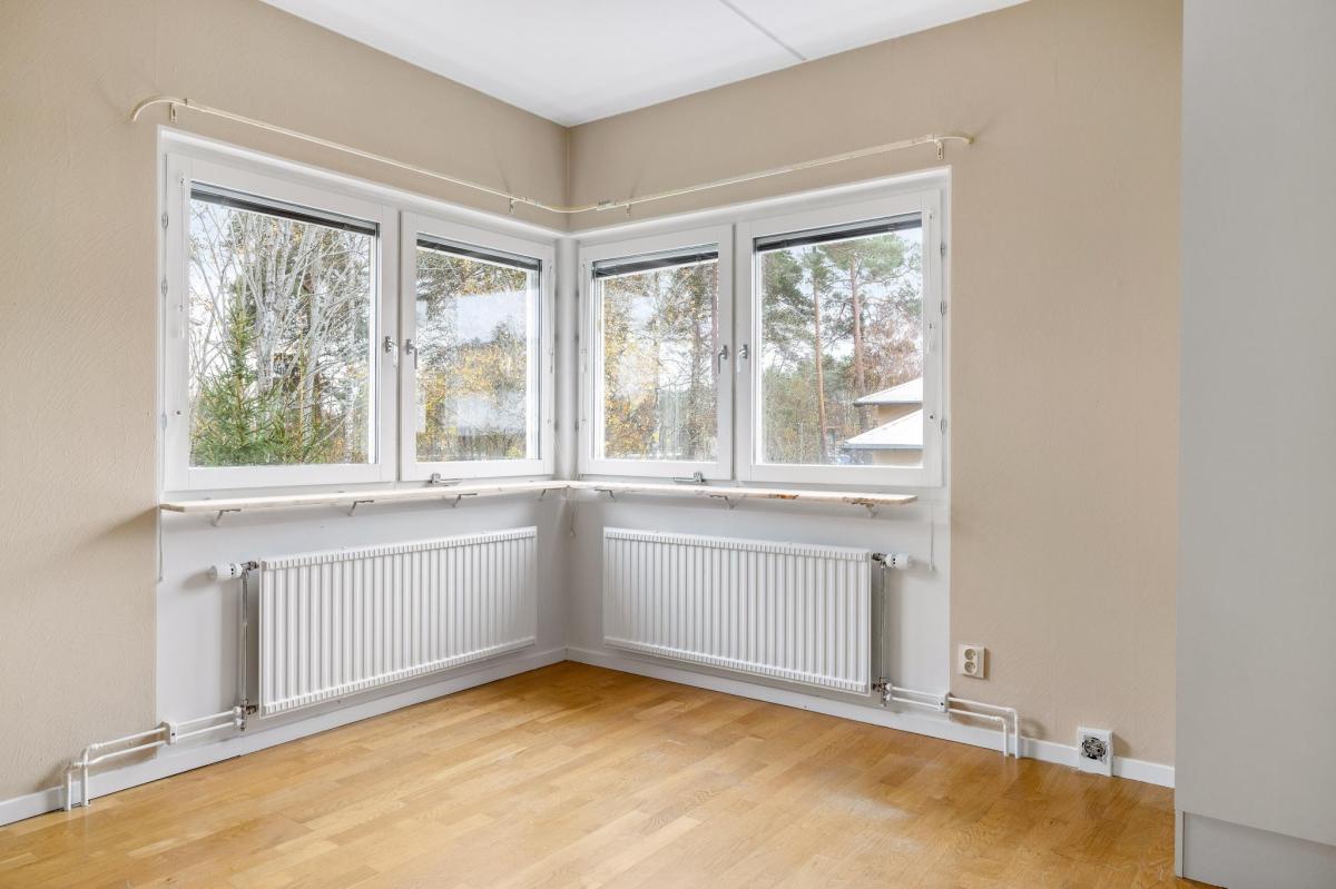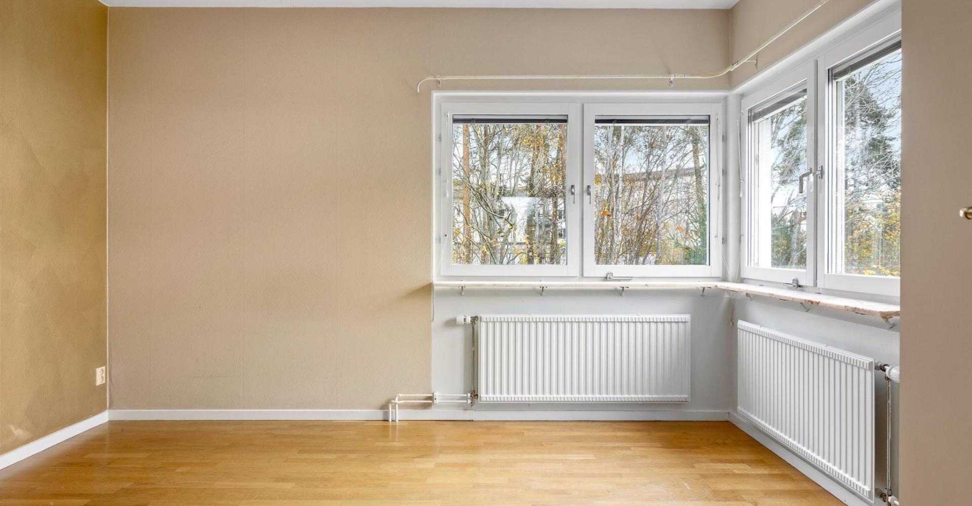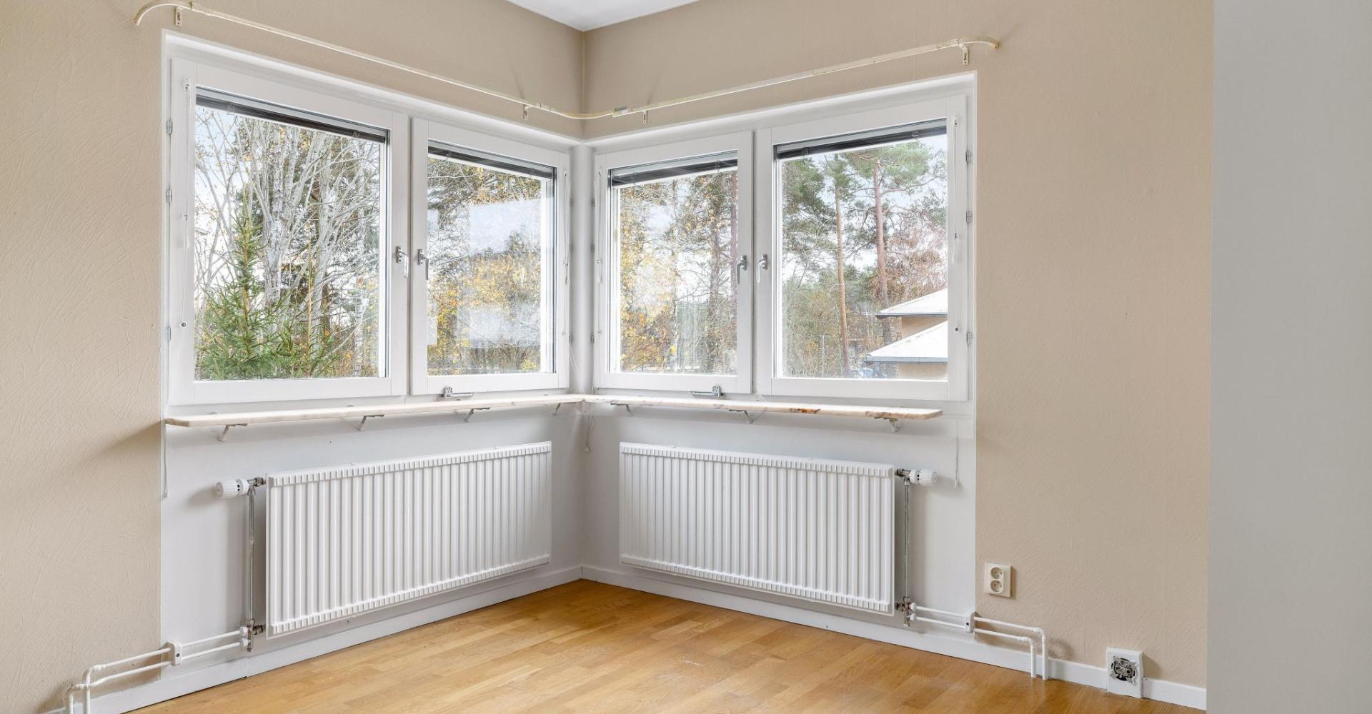 Vardagsrum med ekparkettgolv samt målade väggar.
